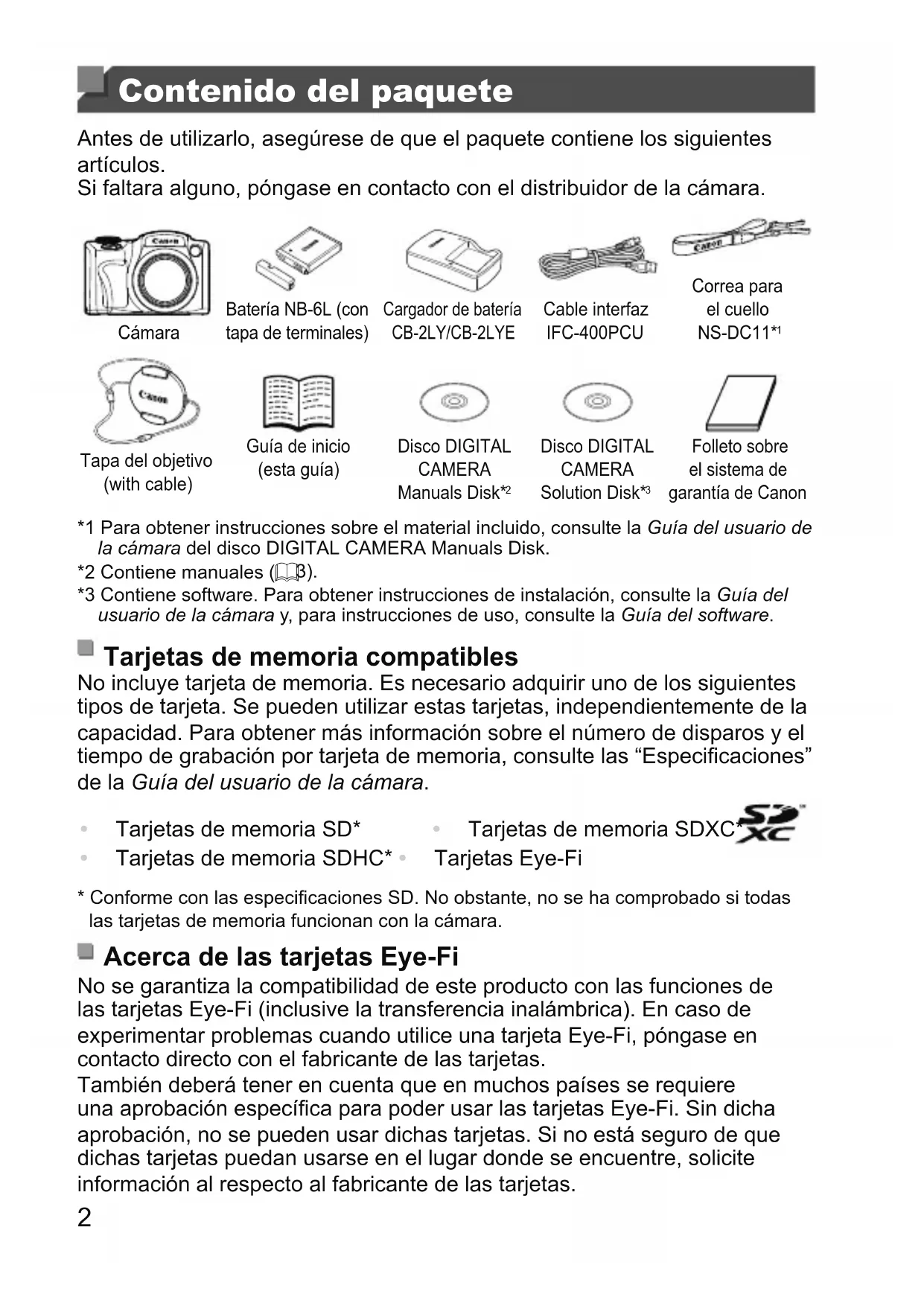 Folleto sobre el sistema de garantía de Canon *1 Para obtener instrucciones sobre el material incluido, consulte la Guía del usuario de la cámara del disco DIGITAL CAMERA Manuals Disk. *2 Contiene manuales (= 3). *3 Contiene software. Para obtener instrucciones de instalación, consulte la Guía del usuario de la cámara y, para instrucciones de uso, consulte la Guía del software. Tarjetas de memoria compatibles No incluye tarjeta de memoria. Es necesario adquirir uno de los siguientes tipos de tarjeta. Se pueden utilizar estas tarjetas, independientemente de la capacidad. Para obtener más información sobre el número de disparos y el tiempo de grabación por tarjeta de memoria, consulte las “Especicaciones” de la Guía del usuario de la cámara.