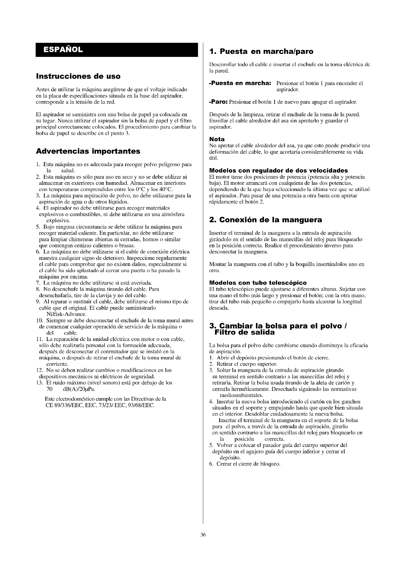 - El aspirador se detiene – El sistema de protección térmica ha desconectado el motor como resultado de una obstrucción en la manguera, tubo ó boquilla, por io que deberá desatascarlos. Mantenimiento Mantenga el aspirador en un lugar seco. Los cojinetes del motor se hallan preengrasados. El aspirador se ha diseñado para el trabajo en continuo. Sin embargo, después de cierto periodo de utilización dependiendo del número de horas trabajadas, los filtros de polvo deberán cambiarse. Limpiar el depósito con un paño seco, utilizando algún tipo de limpiador apropiado. Para detalles del servicio post-venta contacte directamente con Nilfisk.38 Advertencias importantes