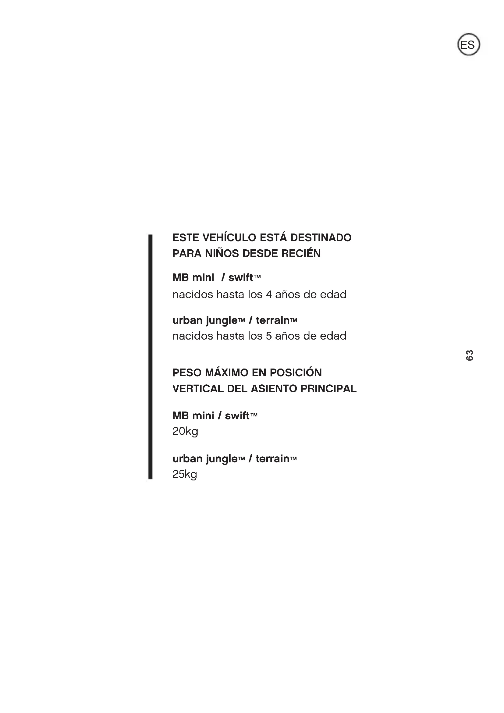 - Este vehículo esta planeado para niños de recién nacido a 4 años y peso máximo de 20kg (MB mini / swift™) / 5 años y peso máximo de 25kg (urban jungle™ / terrain™).
