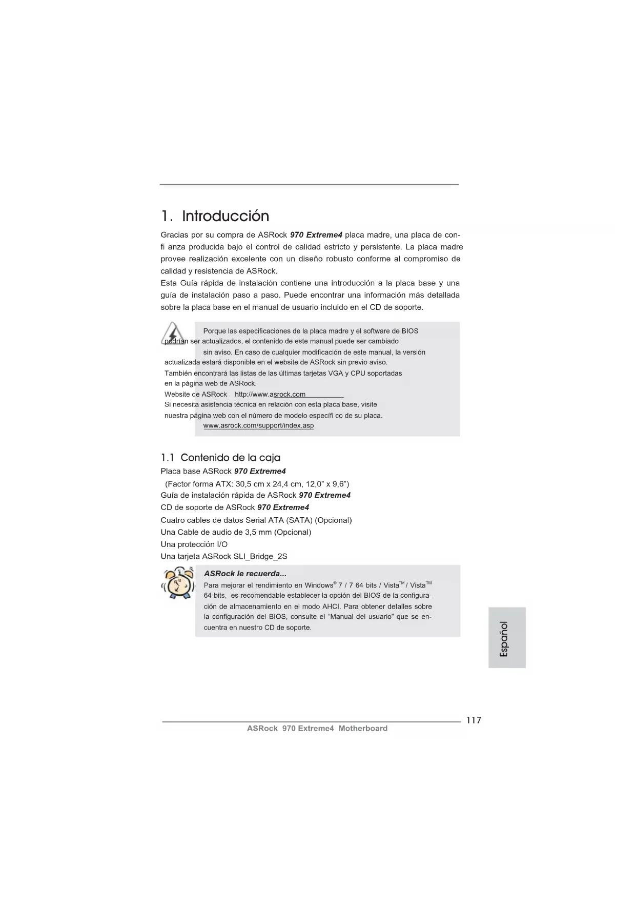 Placa base ASRock 970 Extreme4 (Factor forma ATX: 30,5 cm x 24,4 cm, 12,0” x 9,6”) Guía de instalación rápida de ASRock 970 Extreme4 CD de soporte de ASRock 970 Extreme4 Cuatro cables de datos Serial ATA (SATA) (Opcional) Una Cable de audio de 3,5 mm (Opcional) Una protección I/O Una tarjeta ASRock SLI_Bridge_2S ASRock le recuerda... Para mejorar el rendimiento en Windows
