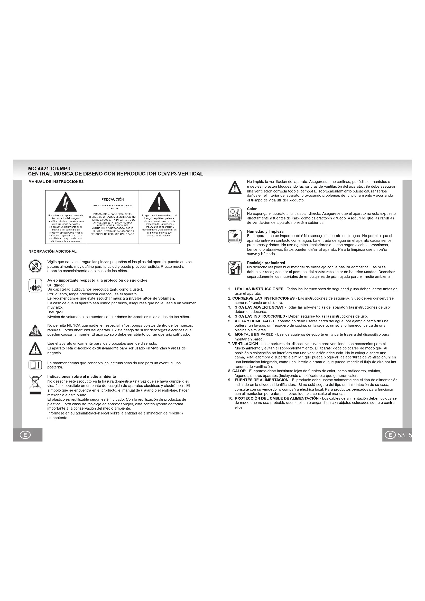 PERSONAL DE SERVICIO CALIFICADO. MC 4421 CD/MP3 CENTRAL MUSICA DE DISEÑO CON REPRODUCTOR CD/MP3 VERTICAL No impida la ventilación del aparato. Asegúrese, que cortinas, periódicos, manteles o muebles no estén bloqueando las ranuras de ventilación del aparato. ¡Se debe asegurar una ventilación correcta todo el tiempo! El sobrecalentamiento puede causar serios daños en el interior del aparato, provocando problemas de funcionamiento y acortando el tiempo de vida útil del producto. Indicaciones sobre el medio ambiente No deseche este producto en la basura doméstica una vez que se haya cumplido su vida útil, deposítelo en un punto de recogida de aparatos eléctricos y electrónicos. El símbolo que se encuentra en el producto, el manual de usuario o el embalaje, hacen referencia a este punto. El plástico es reutilizable según esté indicado. Con la reutilización de productos de plástico u otra clase de reciclaje de aparatos viejos, está contribuyendo de forma importante a la conservación del medio ambiente. Infórmese en su administración local sobre la entidad de eliminación de residuos competente. Le recomendamos que conserve las instrucciones de uso para un eventual uso posterior. Calor No exponga el aparato a la luz solar directa. Asegúrese que el aparato no esta expuesto directamente a fuentes de calor como calefactores o fuego. Asegúrese que las ranur as de ventilación del aparato no esté n cubiertas. Humedad y limpieza Este aparato no es impermeable! No sumerja el aparato en el agua. No permite que el aparato entre en contacto con el agua. La entrada de agua en el aparato causa serios problemas y daños. No use agentes limpiadores que contengan alcohol, amoniacos, benceno o abrasivos. Éstos pueden dañar al aparato. Para la limpieza use un paño suave y húmedo. No permita NUNCA que nadie, en especial niños, ponga objetos dentro de los huecos, ranuras u otras aberturas del aparato. Existe riesgo de sufrir descargas eléctricas que pueden causar la muerte. El aparato solo debe ser abierto por un operario calificado. Vigile que nadie se trague las piezas pequeñas ni las pilas del aparato, puesto que es potencialmente muy dañino para la salud y puede provocar asfixia. Preste mucha atención especialmente en el caso de los niños. Aviso importante respecto a la protección de sus oídos Cuidado: Su capacidad auditiva nos preocupa tanto como a usted. Por lo tanto, tenga precaución cuando use el aparato. Le recomendamos que evite escuchar música a niveles altos de volumen. En caso de que el aparato sea usado por niños, asegúrese que no la usen a un volumen muy alto. ¡Peligro! Niveles de volumen altos pueden causar daños irreparables a los oídos de los niños. Use el aparato únicamente para los propósitos que fue diseñado. El aparato está concebido exclusivamente para ser usado en viviendas y áreas de negocio. Reciclaje profesional No deseche las pilas ni el material de embalaje con la basura doméstica. Las pilas deben ser recogidas por el personal del centro recolector de baterías usadas. Desechar separadamente los materiales de embalaje es de gran ayuda para el medio ambiente.