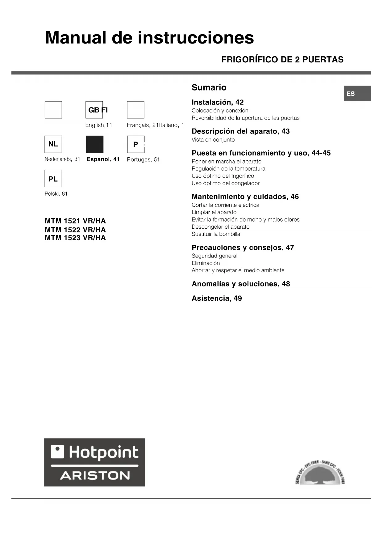 MTM 1521 VRHA - Refrigerador HOTPOINT ARISTON - Manual de uso y guía de instrucciones gratis