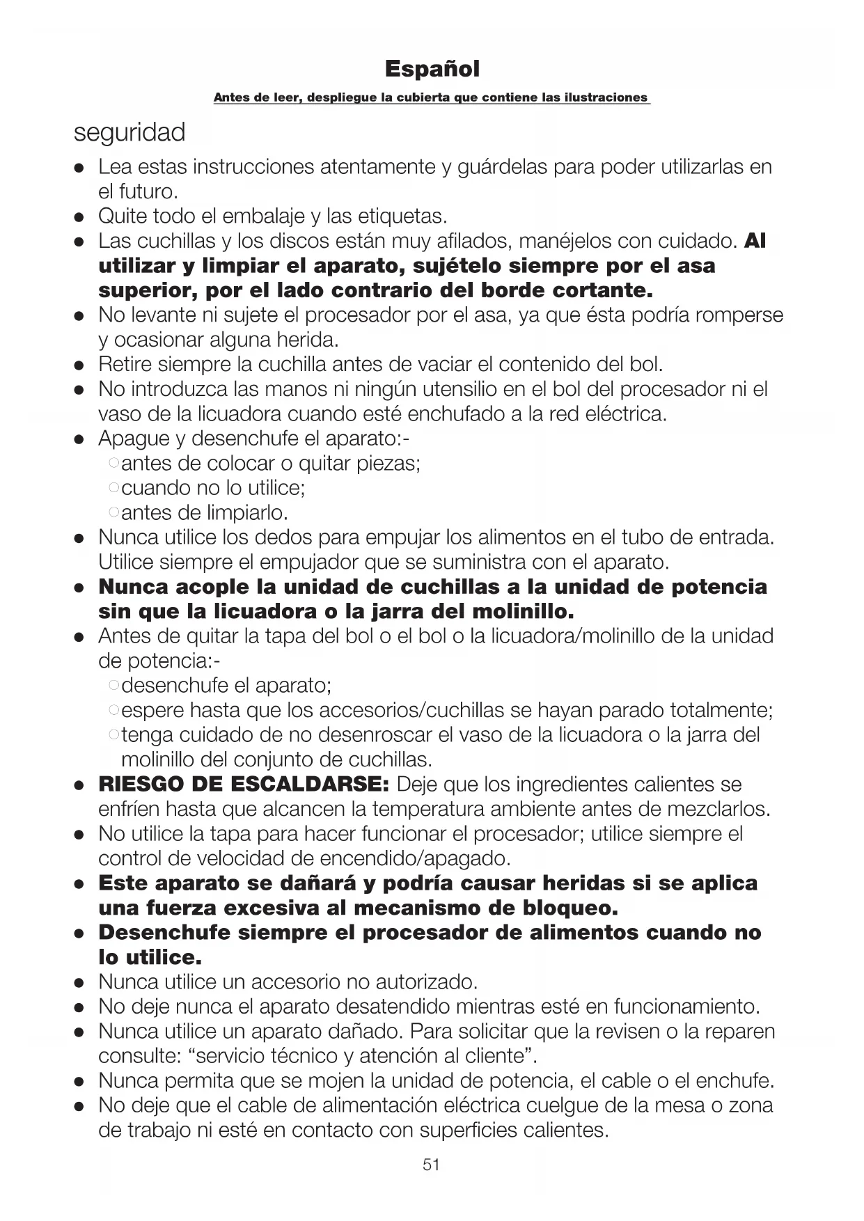 No introduzca las manos ni ningún utensilio en el bol del procesador ni el vaso de la licuadora cuando esté enchufado a la red eléctrica.