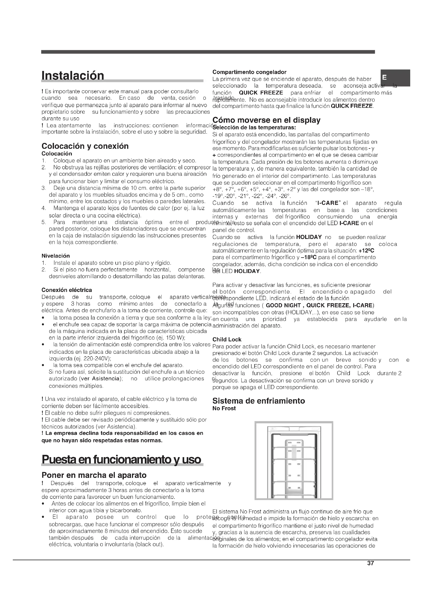 - El aparato posee un control que lo protege contra sobrecargas,quehacefuncionarelcompresorsólodespués deaproximadamente8minutosdelencendido.Estosucede tambiéndespués de cadainterrupción dela alimentación eléctrica,voluntariaoinvoluntaria(blackout). Compartimento congelador Laprimeravezqueseenciendeelaparato,despuésdehaber seleccionado la temperaturadeseada, se aconsejaactivar la función QUICK FREEZE paraenfriar el compartimentomás rápidamente.Noesaconsejableintroducirlosalimentosdentro delcompartimentohastaquefinalicelafunciónQUICK FREEZE. Cómo moverse en el display Selección de las temperaturas: Sielaparatoestáencendido,laspantallasdelcompartimento frigoríficoydelcongeladormostraránlastemperaturasfijadasen esemomento.Paramodificarlasessuficientepulsarlosbotones- y +correspondientesalcompartimentoenelquesedeseacambiar latemperatura.Cadapresióndelosbotonesaumentaodisminuye latemperaturay,demaneraequivalente,tambiénlacantidadde fríogeneradoenelinteriordelcompartimento.Lastemperaturas quesepuedenseleccionarenelcompartimentofrigoríficoson +8°,+7°,+6°,+5°,+4°,+3°,+2°ylasdelcongeladorson–18°, -19°,-20°,-21°,-22°,-24°,-26°. Cuando se activa lafunción “I-CARE”el aparato regula automáticamentelas temperaturas en basea las condiciones internasy externas delfrigorífico consumiendo una energía mínima,estoseseñalaconelencendidodelLEDI-CAREenel paneldecontrol. Cuandose activa lafunciónHOLIDAY no sepuedenrealizar regulacionesde temperatura, peroel aparato se coloca automáticamenteenlaregulaciónóptimaparalasituación:+12ºC paraelcompartimentofrigoríficoy–18ºCparaelcompartimento congelador,además,dichacondiciónseindicaconelencendido delLEDHOLIDAY. Paraactivarydesactivarlasfunciones,essuficientepresionar elbotón correspondiente. El encendidooapagado del correspondienteLED,indicaráelestadodelafunción Algunasfunciones( GOOD NIGHT , QUICK FREEZE, I-CARE) sonincompatiblesconotras(HOLIDAY,..),enesecasosetiene encuenta una prioridad ya establecida para ayudarle enla administracióndelaparato. Child Lock ParapoderactivarlafunciónChildLock,esnecesariomantener presionadoelbotónChildLockdurante2segundos.Laactivación delos botones se confirma conun breve sonidoy con el encendidodelLEDcorrespondienteenelpaneldecontrol.Para desactivarla función, presione elbotón Child Lock durante2 segundos.Ladesactivaciónseconfirmaconunbrevesonidoy porqueseapagaelLEDcorrespondiente. Sistema de enfriamiento No Frost ElsistemaNoFrostadministraunflujocontinuodeairefríoque recogelahumedadeimpidelaformacióndehieloyescarcha:en elcompartimentofrigoríficomantieneeljustoniveldehumedad y,graciasalaausenciadeescarcha,preservalascualidades originalesdelosalimentos;enelcompartimentocongeladorevita laformacióndehielovolviendoinnecesariaslasoperacionesde38
