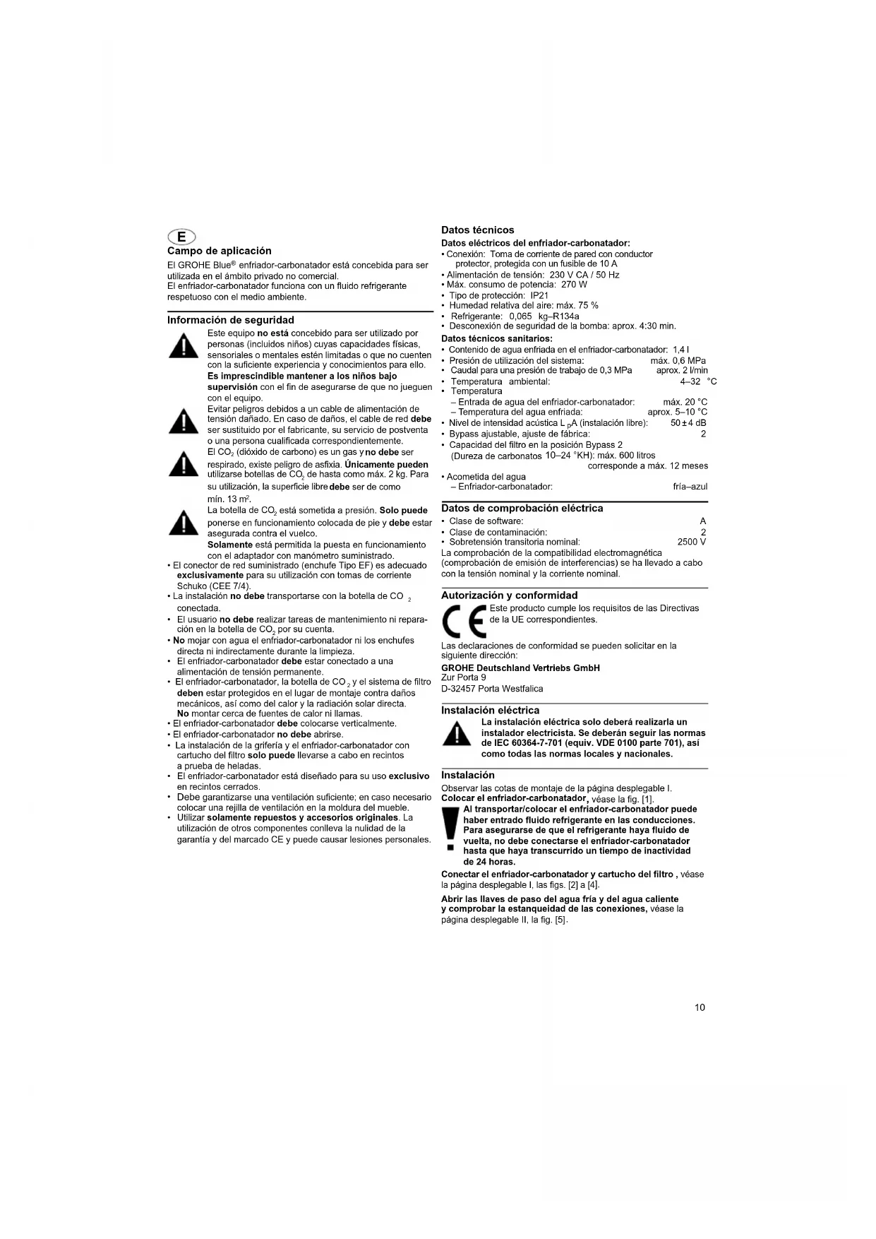 - Sobretensión transitoria nominal: 2500 V La comprobación de la compatibilidad electromagnética (comprobación de emisión de interferencias) se ha llevado a cabo con la tensión nominal y la corriente nominal. Autorización y conformidad Las declaraciones de conformidad se pueden solicitar en la siguiente dirección: GROHE Deutschland Vertriebs GmbH Zur Porta 9 D-32457 Porta Westfalica Instalación eléctrica La instalación eléctrica solo deberá realizarla un instalador electricista. Se deberán seguir las normas de IEC 60364-7-701 (equiv. VDE 0100 parte 701), así como todas las normas locales y nacionales. Instalación Observar las cotas de montaje de la página desplegable I. Colocar el enfriador-carbonatador , véase la fig. [1]. Al transportar/colocar el enfriador-carbonatador puede haber entrado fluido refrigerante en las conducciones. Para asegurarse de que el refrigerante haya fluido de vuelta, no debe conectarse el enfriador-carbonatador hasta que haya transcurrido un tiempo de inactividad de 24 horas. Conectar el enfriador-carbonatador y cartucho del filtro , véase la página desplegable I, las figs. [2] a [4
