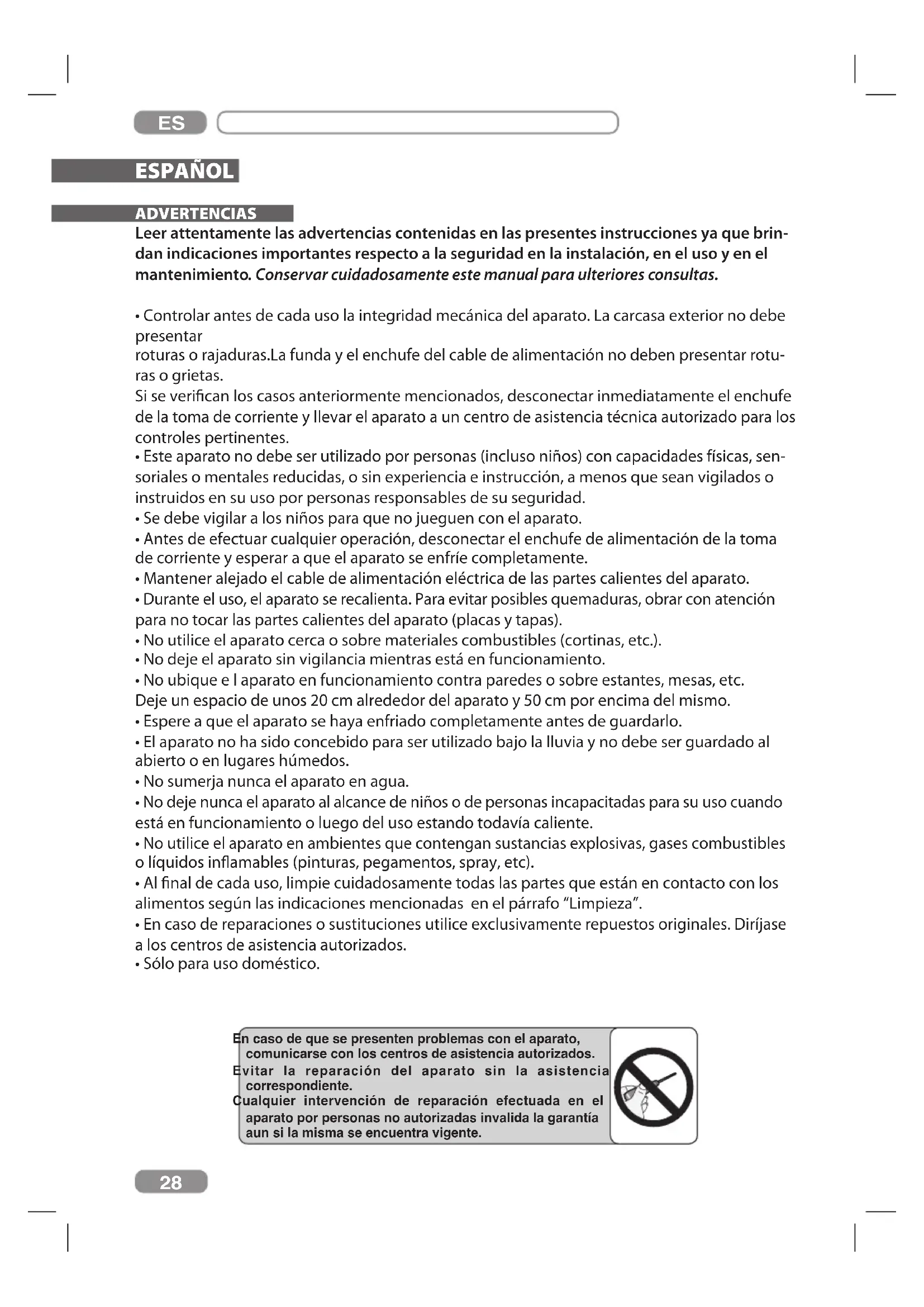 - Sólo para uso doméstico. En caso de que se presenten problemas con el aparato, comunicarse con los centros de asistencia autorizados. Evitar la reparación del aparato sin la asistencia correspondiente. Cualquier intervención de reparación efectuada en el aparato por personas no autorizadas invalida la garantía aun si la misma se encuentra vigente.