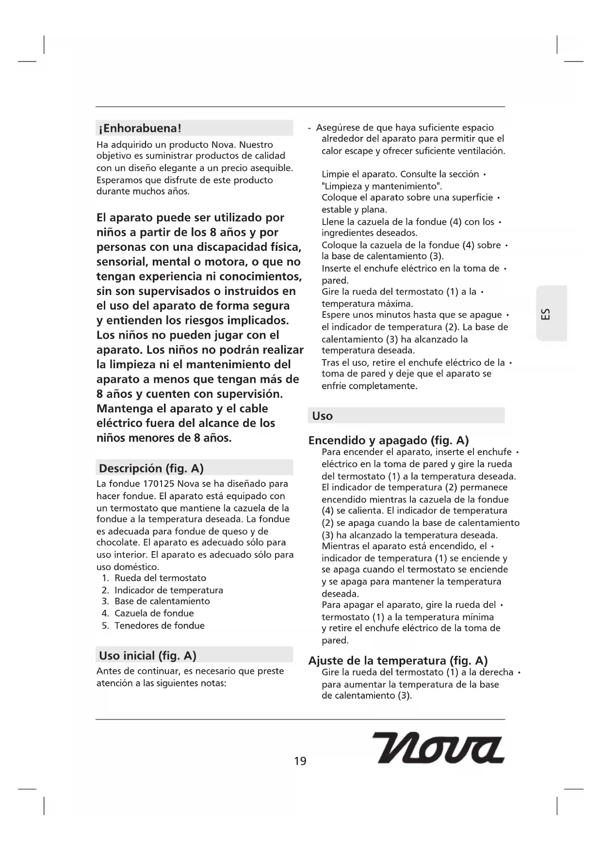¡Enhorabuena! Ha adquirido un producto Nova. Nuestro objetivo es suministrar productos de calidad con un diseño elegante a un precio asequible. Esperamos que disfrute de este producto durante muchos años. El aparato puede ser utilizado por niños a partir de los 8 años y por personas con una discapacidad física, sensorial, mental o motora, o que no tengan experiencia ni conocimientos, sin son supervisados o instruidos en el uso del aparato de forma segura y entienden los riesgos implicados. Los niños no pueden jugar con el aparato. Los niños no podrán realizar la limpieza ni el mantenimiento del aparato a menos que tengan más de 8 años y cuenten con supervisión. Mantenga el aparato y el cable eléctrico fuera del alcance de los niños menores de 8 años. Descripción (fig. A) La fondue 170125 Nova se ha diseñado para hacer fondue. El aparato está equipado con un termostato que mantiene la cazuela de la fondue a la temperatura deseada. La fondue es adecuada para fondue de queso y de chocolate. El aparato es adecuado sólo para uso interior. El aparato es adecuado sólo para uso doméstico.