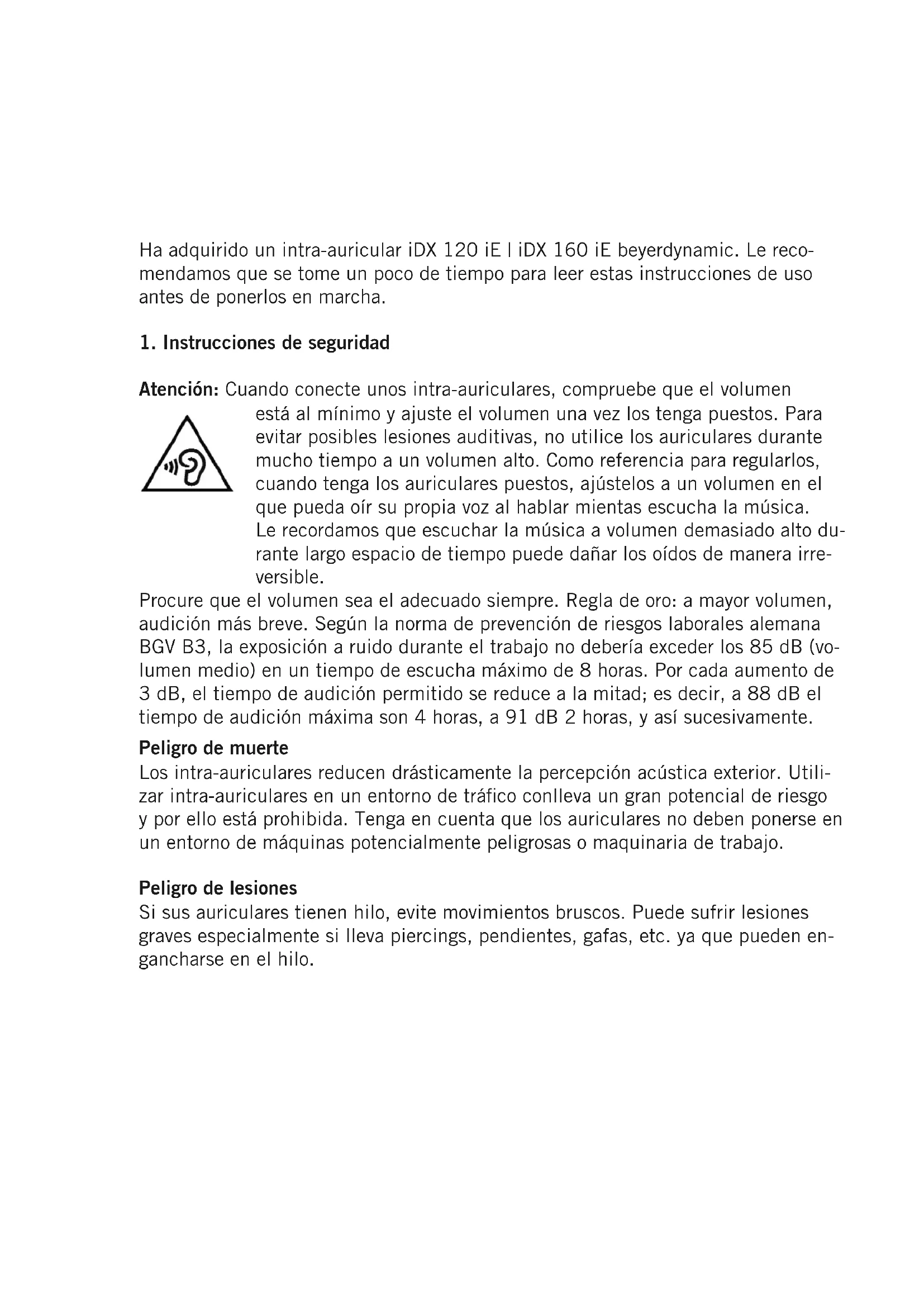 Atención: Cuando conecte unos intra-auriculares, compruebe que el volumen está al mínimo y ajuste el volumen una vez los tenga puestos. Para evitar posibles lesiones auditivas, no utilice los auriculares durante mucho tiempo a un volumen alto. Como referencia para regularlos, cuando tenga los auriculares puestos, ajústelos a un volumen en el que pueda oír su propia voz al hablar mientas escucha la música. Le recordamos que escuchar la música a volumen demasiado alto du- rante largo espacio de tiempo puede dañar los oídos de manera irre- versible. Procure que el volumen sea el adecuado siempre. Regla de oro: a mayor volumen, audición más breve. Según la norma de prevención de riesgos laborales alemana BGV B3, la exposición a ruido durante el trabajo no debería exceder los 85 dB (vo- lumen medio) en un tiempo de escucha máximo de 8 horas. Por cada aumento de 3 dB, el tiempo de audición permitido se reduce a la mitad; es decir, a 88 dB el tiempo de audición máxima son 4 horas, a 91 dB 2 horas, y así sucesivamente. Peligro de muerte Los intra-auriculares reducen drásticamente la percepción acústica exterior. Utili- zar intra-auriculares en un entorno de tráfico conlleva un gran potencial de riesgo y por ello está prohibida. Tenga en cuenta que los auriculares no deben ponerse en un entorno de máquinas potencialmente peligrosas o maquinaria de trabajo. Peligro de lesiones Si sus auriculares tienen hilo, evite movimientos bruscos. Puede sufrir lesiones graves especialmente si lleva piercings, pendientes, gafas, etc. ya que pueden en- gancharse en el hilo.español 28 | 29 Cambio de la percepción acústica Muchas personas precisan cierto tiempo para habituarse a los intra-auriculares ya que estos alteran la percepción acústica de la propia voz, el sonido inherente al andar y cambian de las situaciones "normales". No obstante esta sensación extraña suele desaparecer después de llevar los auriculares un rato.