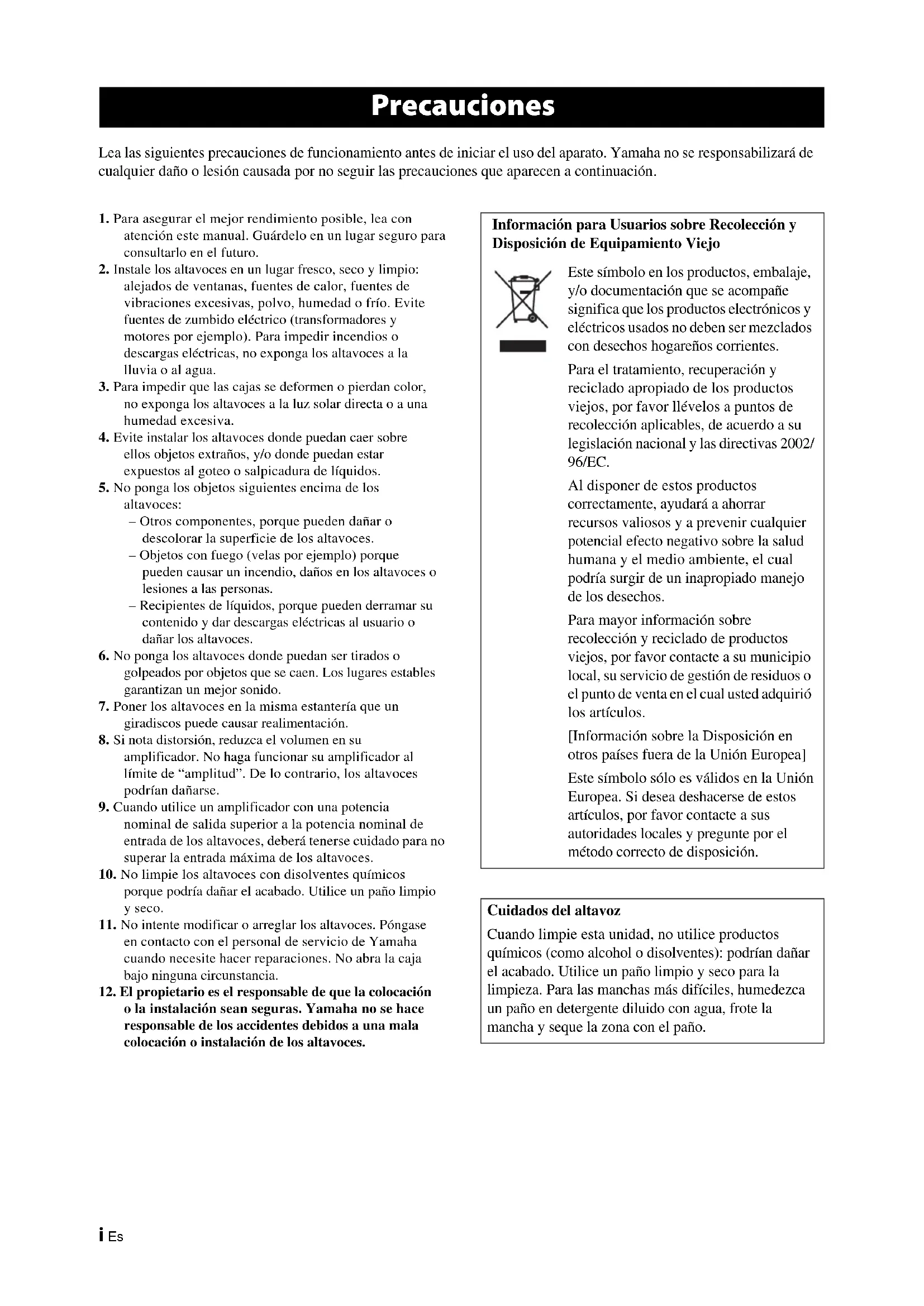 o la instalación sean seguras. Yamaha no se hace responsable de los accidentes debidos a una mala colocación o instalación de los altavoces. Precauciones Información para Usuarios sobre Recolección y Disposición de Equipamiento Viejo Este símbolo en los productos, embalaje, y/o documentación que se acompañe significa que los productos electrónicos y eléctricos usados no deben ser mezclados con desechos hogareños corrientes. Para el tratamiento, recuperación y reciclado apropiado de los productos viejos, por favor llévelos a puntos de recolección aplicables, de acuerdo a su legislación nacional y las directivas 2002/ 96/EC. Al disponer de estos productos correctamente, ayudará a ahorrar recursos valiosos y a prevenir cualquier potencial efecto negativo sobre la salud humana y el medio ambiente, el cual podría surgir de un inapropiado manejo de los desechos. Para mayor información sobre recolección y reciclado de productos viejos, por favor contacte a su municipio local, su servicio de gestión de residuos o el punto de venta en el cual usted adquirió los artículos. [Información sobre la Disposición en otros países fuera de la Unión Europea] Este símbolo sólo es válidos en la Unión Europea. Si desea deshacerse de estos artículos, por favor contacte a sus autoridades locales y pregunte por el método correcto de disposición. Cuidados del altavoz Cuando limpie esta unidad, no utilice productos químicos (como alcohol o disolventes): podrían dañar el acabado. Utilice un paño limpio y seco para la limpieza. Para las manchas más difíciles, humedezca un paño en detergente diluido con agua, frote la mancha y seque la zona con el paño.1 Es Español Compruebe que el paquete contiene los siguientes elementos. Antes de conectar los altavoces, sitúe cada altavoz en la posición correspondiente. La ubicación de los altavoces es muy importante, ya que afecta a la calidad de sonido global del sistema. Sitúe los altavoces en ubicaciones que optimicen la calidad de sonido en la posición de audición. Consulte la ilustración.