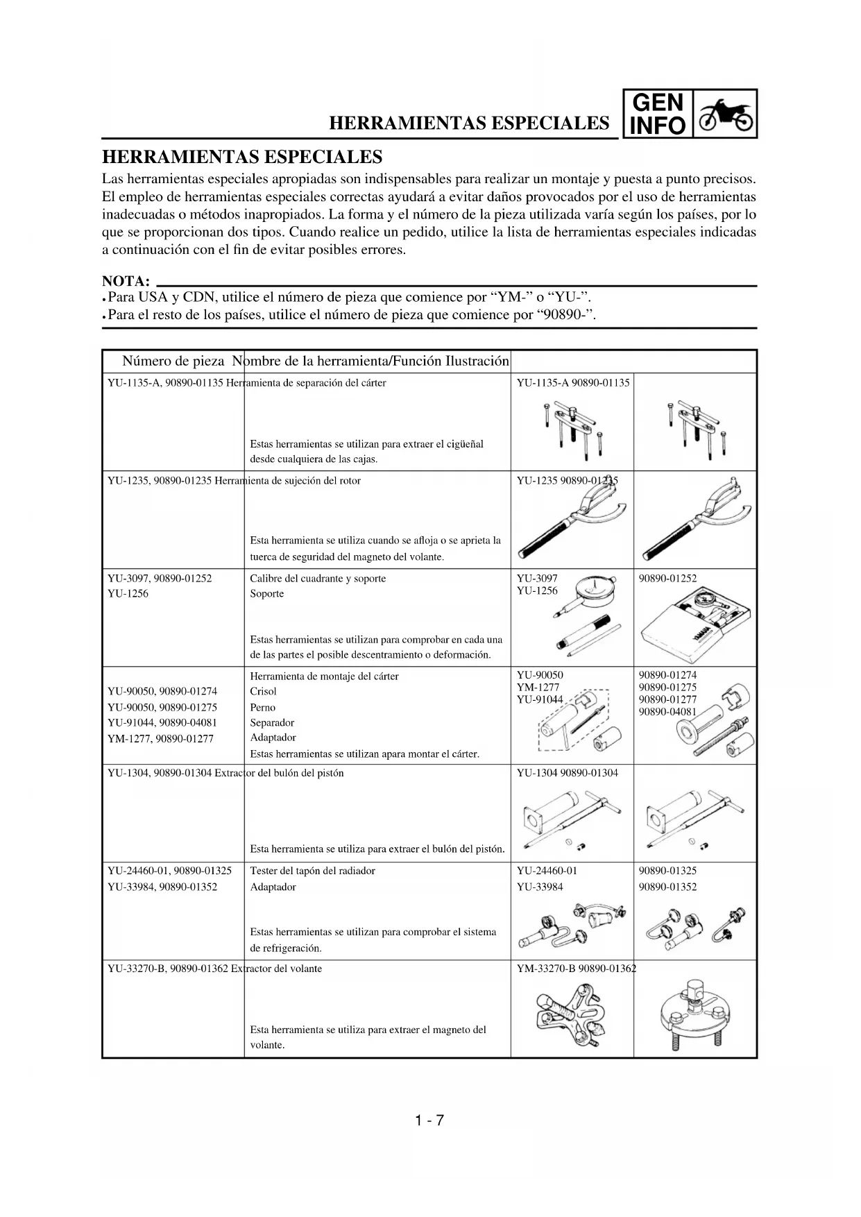 (Consulte la ilustración) Los símbolos ilustrados 1 a 7 están diseñados como lengüetas a seguir con el dedo para indicar el número del capítulo y el contenido. 1 Información general 2 Especificaciones 3 Ajustes e inspección regulares 4 Motor 5 Chasis 6 Sistema eléctrico 7 Puesta a punto Los símbolos ilustrados 8 a D se utili- zan para identificar las especificaciones que aparezcan en el texto. 8 Con el motor montado 9 Herramienta especial 0 Líquido a añadir A Lubricante B Apriete C Valor especificado, límite de servicio D Resistencia (W), Voltaje (V), Sistema eléctrico actual (A) Los símbolos ilustrados E a H del diagrama de despiece indican el grado del lubricante y la ubicación del punto a lubricar. E Aplicar aceite de motor F Aplicar aceite de disulfuro de molibdeno G Aplicar grasa ligera de litio H Aplicar grasa de disulfuro de molibdeno Los símbolos ilustrados I a J del diagrama de despiece indican dónde aplicar un producto de bloqueo y dónde instalar las nuevas piezas. I Aplicar un producto de bloqueo (LOC- TITE