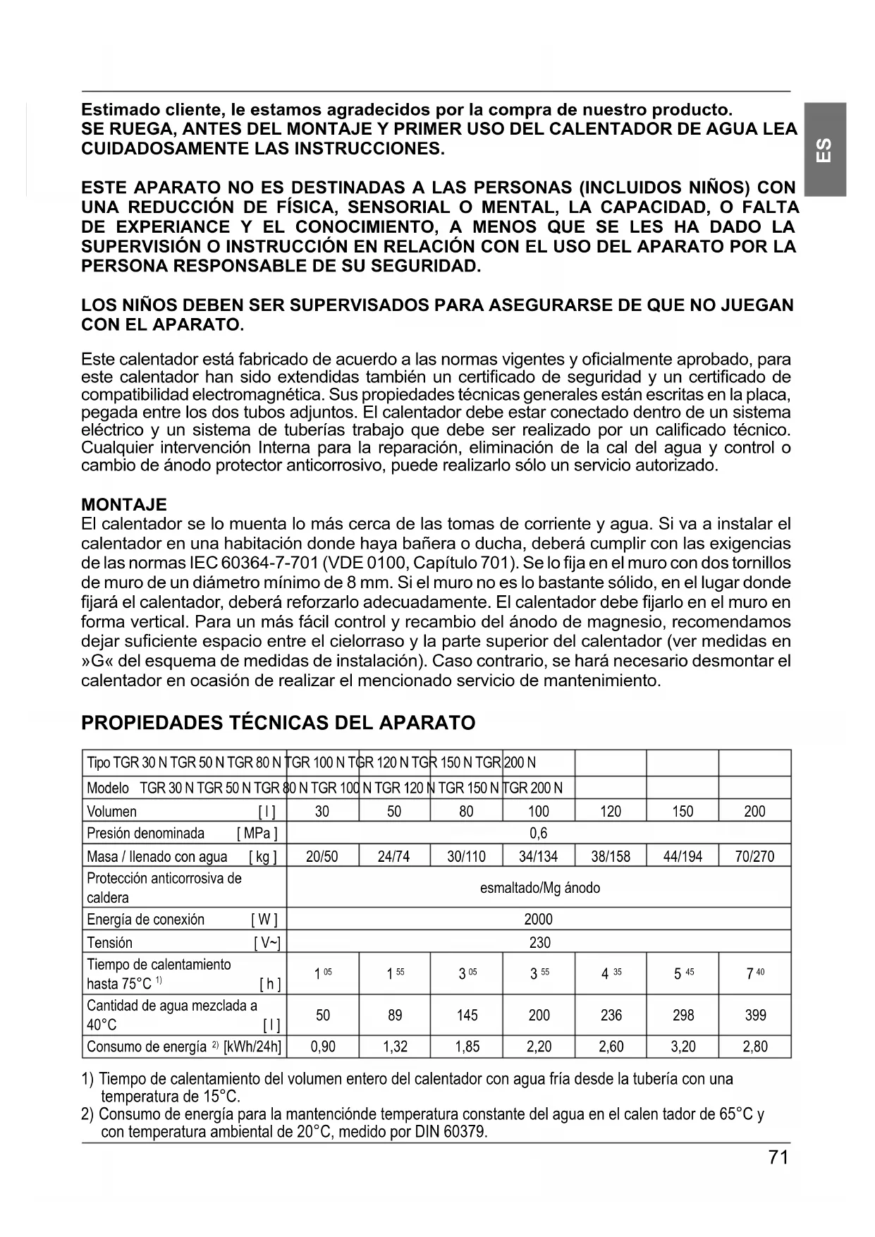 Estimado cliente, le estamos agradecidos por la compra de nuestro producto. SE RUEGA, ANTES DEL MONTAJE Y PRIMER USO DEL CALENTADOR DE AGUA LEA CUIDADOSAMENTE LAS INSTRUCCIONES. ESTE APARATO NO ES DESTINADAS A LAS PERSONAS (INCLUIDOS NIÑOS) CON UNA REDUCCIÓN DE FÍSICA, SENSORIAL O MENTAL, LA CAPACIDAD, O FALTA DE EXPERIANCE Y EL CONOCIMIENTO, A MENOS QUE SE LES HA DADO LA SUPERVISIÓN O INSTRUCCIÓN EN RELACIÓN CON EL USO DEL APARATO POR LA PERSONA RESPONSABLE DE SU SEGURIDAD. LOS NIÑOS DEBEN SER SUPERVISADOS PARA ASEGURARSE DE QUE NO JUEGAN CON EL APARATO. Este calentador está fabricado de acuerdo a las normas vigentes y ofi cialmente aprobado, para este calentador han sido extendidas también un certifi cado de seguridad y un certifi cado de compatibilidad electromagnética. Sus propiedades técnicas generales están escritas en la placa, pegada entre los dos tubos adjuntos. El calentador debe estar conectado dentro de un sistema eléctrico y un sistema de tuberías trabajo que debe ser realizado por un califi cado técnico. Cualquier intervención Interna para la reparación, eliminación de la cal del agua y control o cambio de ánodo protector anticorrosivo, puede realizarlo sólo un servicio autorizado. MONTAJE El calentador se lo muenta lo más cerca de las tomas de corriente y agua. Si va a instalar el calentador en una habitación donde haya bañera o ducha, deberá cumplir con las exigencias de las normas IEC 60364-7-701 (VDE 0100, Capítulo 701). Se lo fi ja en el muro con dos tornillos de muro de un diámetro mínimo de 8 mm. Si el muro no es lo bastante sólido, en el lugar donde fi jará el calentador, deberá reforzarlo adecuadamente. El calentador debe fi jarlo en el muro en forma vertical. Para un más fácil control y recambio del ánodo de magnesio, recomendamos dejar sufi ciente espacio entre el cielorraso y la parte superior del calentador (ver medidas en »G« del esquema de medidas de instalación). Caso contrario, se hará necesario desmontar el calentador en ocasión de realizar el mencionado servicio de mantenimiento.