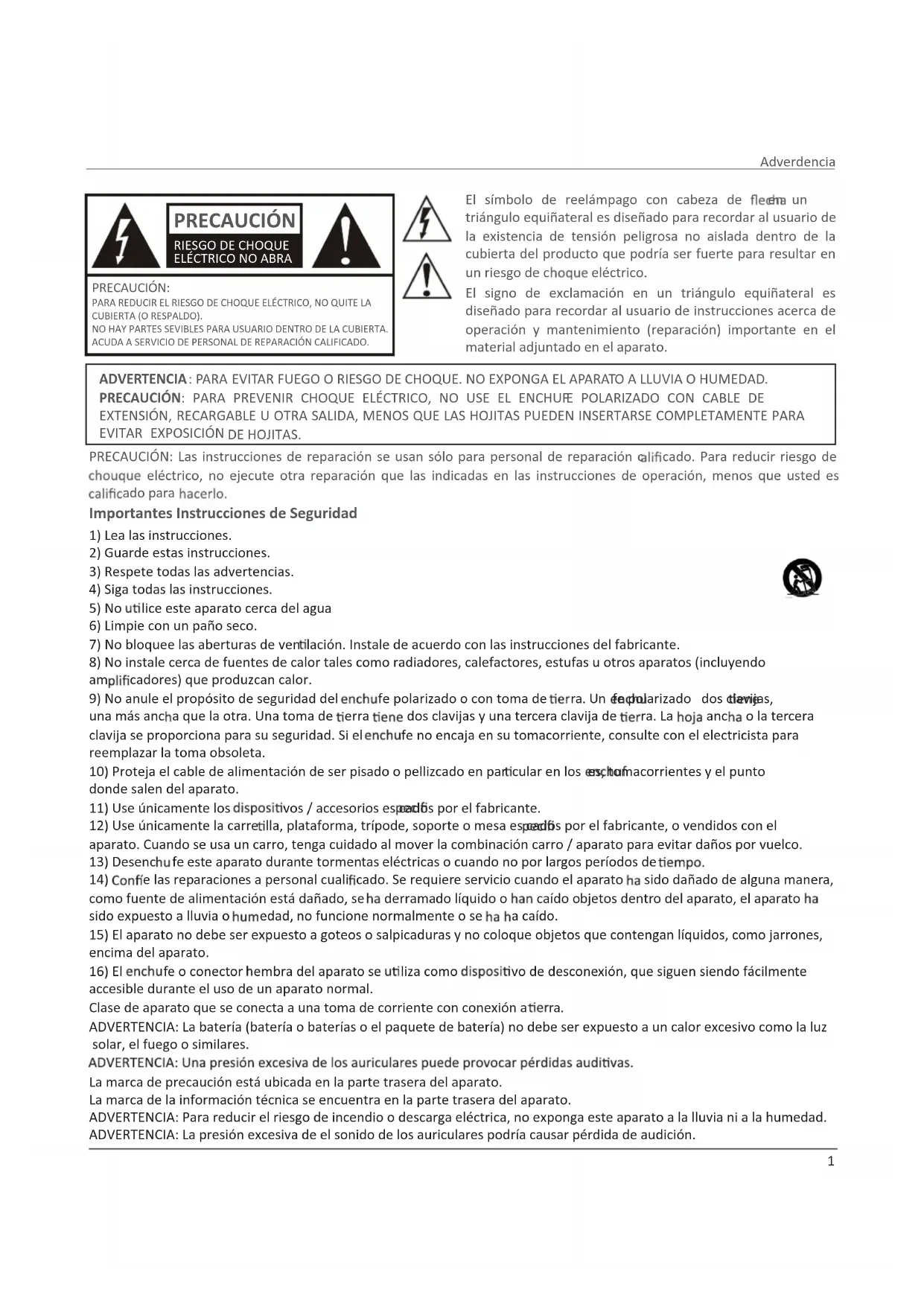 ADVERTENCIA: La batería (batería o baterías o el paquete de batería) no debe ser expuesto a un calor excesivo como la luz solar, el fuego o similares. La marca de precaución está ubicada en la parte trasera del aparato. La marca de la información técnica se encuentra en la parte trasera del aparato. ADVERTENCIA: Para reducir el riesgo de incendio o descarga eléctrica, no exponga este aparato a la lluvia ni a la humedad. ADVERTENCIA: La presión excesiva de el sonido de los auriculares podría causar pérdida de audición.Instrucciones de Seguridad