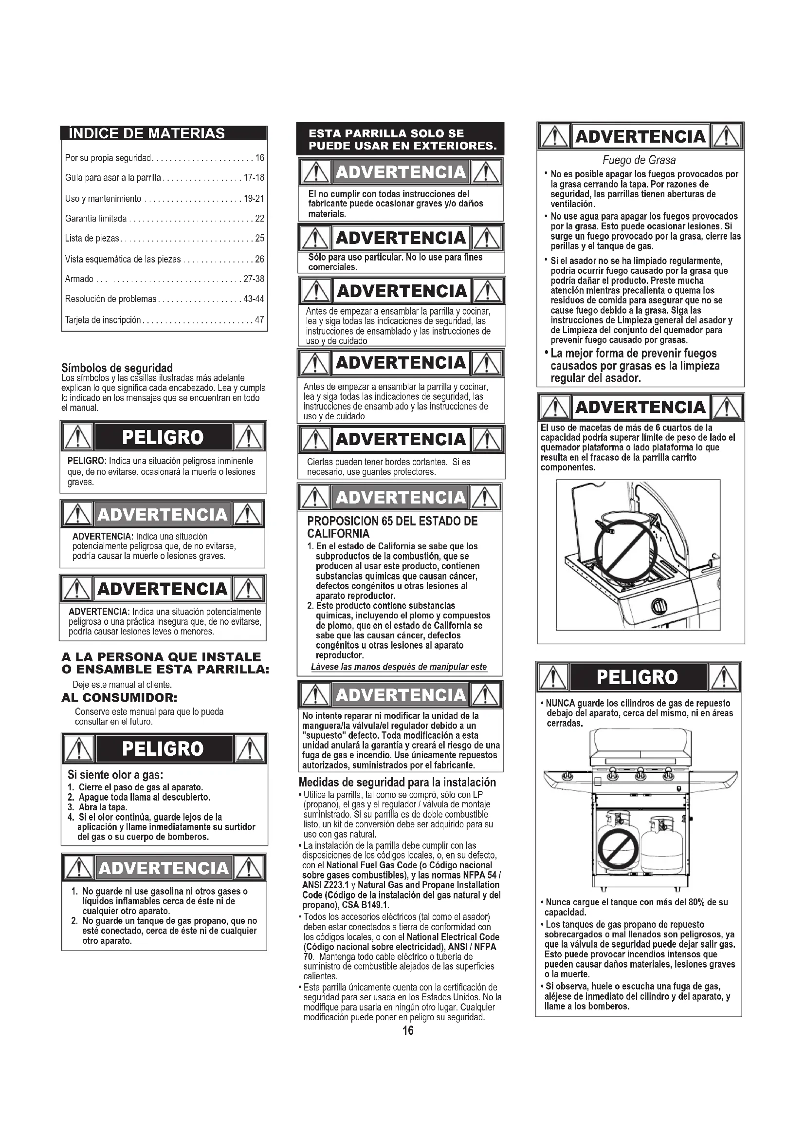 Portée de la couverture Période de couverture Type de défaillances couvertes Brûleur en acier inoxydable À feu et couvercle Reste des pièces 2 ans à compter de la date d'achat * 1 an à compter de la date d'achat * Perforation, Défauts de fabrication et de matériel Uniquement 5 ans à compter de la date d'achat *16 ESTA PARRILLA SOLO SE PUEDE USAR EN EXTERIORES. PELIGRO Símbolos de seguridad Los símbolos y las casillas ilustradas más adelante explican lo que significa cada encabezado. Lea y cumpla lo indicado en los mensajes que se encuentran en todo el manual.PELIGRO: Indica una situación peligrosa inminente que, de no evitarse, ocasionará la muerte o lesiones graves. ADVERTENCIA ADVERTENCIA: Indica una situación potencialmente peligrosa que, de no evitarse, podría causar la muerte o lesiones graves. ADVERTENCIA ADVERTENCIA: Indica una situación potencialmente peligrosa o una práctica insegura que, de no evitarse, podría causar lesiones leves o menores.Sólo para uso particular. No lo use para fines comerciales.1. No guarde ni use gasolina ni otros gases o líquidos inflamables cerca de éste ni de cualquier otro aparato.2. No guarde un tanque de gas propano, que no esté conectado, cerca de éste ni de cualquier otro aparato. PELIGRO Si siente olor a gas:1. Cierre el paso de gas al aparato.2. Apague toda llama al descubierto.3. Abra la tapa.4. Si el olor continúa, guarde lejos de la aplicación y llame inmediatamente su surtidor del gas o su cuerpo de bomberos.El no cumplir con todas instrucciones del fabricante puede ocasionar graves y/o daños materials.Antes de empezar a ensamblar la parrilla y cocinar, lea y siga todas las indicaciones de seguridad, las instrucciones de ensamblado y las instrucciones de uso y de cuidado Antes de empezar a ensamblar la parrilla y cocinar, lea y siga todas las indicaciones de seguridad, las instrucciones de ensamblado y las instrucciones de uso y de cuidado Ciertas pueden tener bordes cortantes. Si es necesario, use guantes protectores. A LA PERSONA QUE INSTALE O ENSAMBLE ESTA PARRILLA:Deje este manual al cliente.AL CONSUMIDOR:Conserve este manual para que lo pueda consultar en el futuro. ADVERTENCIA PELIGRO ADVERTENCIA PELIGRO ADVERTENCIA PELIGRO ADVERTENCIA PELIGRO ADVERTENCIA PELIGRO ADVERTENCIA ADVERTENCIA PROPOSICION 65 DEL ESTADO DE CALIFORNIA 1. En el estado de California se sabe que los subproductos de la combustión, que se producen al usar este producto, contienen substancias químicas que causan cáncer, defectos congénitos u otras lesiones al aparato reproductor.2. Este producto contiene substancias químicas, incluyendo el plomo y compuestos de plomo, que en el estado de California se sabe que las causan cáncer, defectos congénitos u otras lesiones al aparato reproductor.Lávese las manos después de manipular este No intente reparar ni modificar la unidad de la manguera/la válvula/el regulador debido a un "supuesto" defecto. Toda modificación a esta unidad anulará la garantía y creará el riesgo de una fuga de gas e incendio. Use únicamente repuestos autorizados, suministrados por el fabricante. ADVERTENCIA