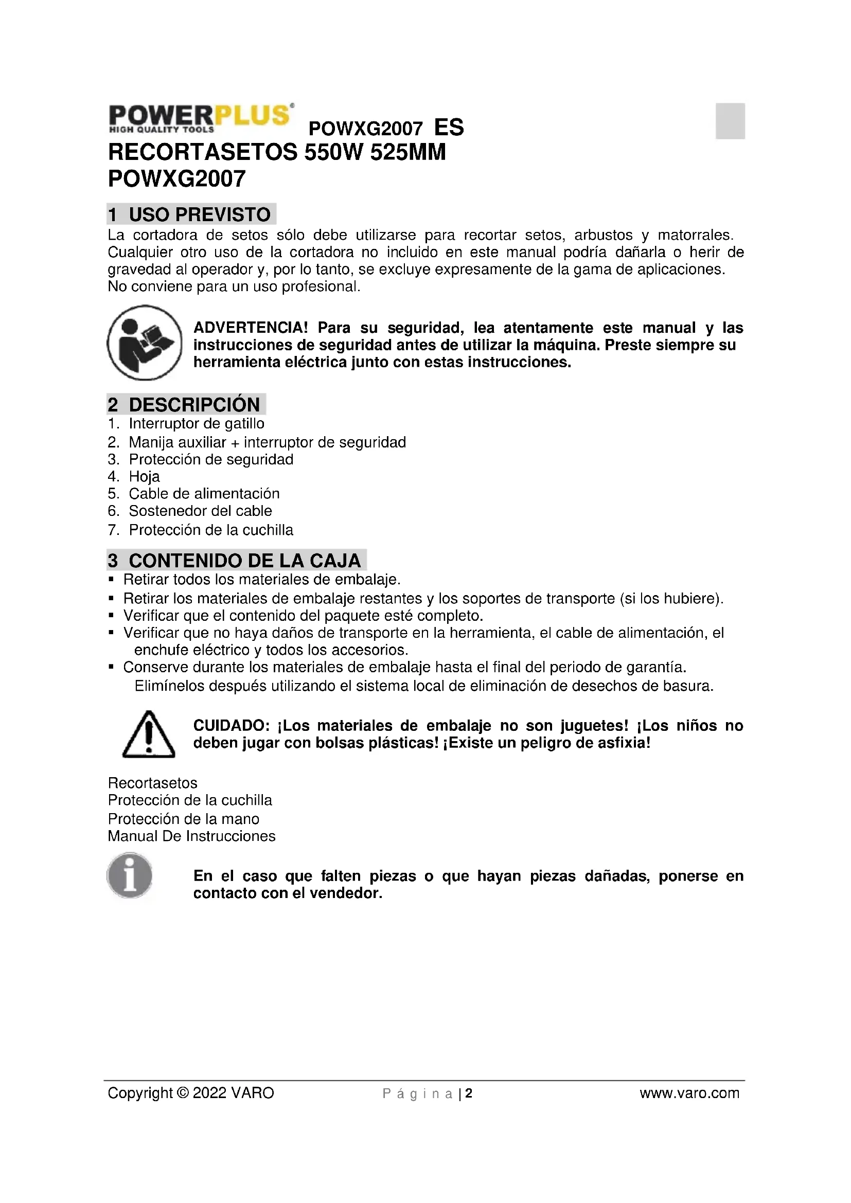 - Conserve durante los materiales de embalaje hasta el final del periodo de garantía. Elimínelos después utilizando el sistema local de eliminación de desechos de basura. CUIDADO: ¡Los materiales de embalaje no son juguetes! ¡Los niños no deben jugar con bolsas plásticas! ¡Existe un peligro de asfixia! Recortasetos Protección de la cuchilla Protección de la mano Manual De Instrucciones En el caso que falten piezas o que hayan piezas dañadas, ponerse en contacto con el vendedor.POWXG2007 ES Copyright © 2022 VARO P á g i n a | 3 www.varo.com 4 SÍMBOLOS En este manual y/o en el aparato mismo se utilizan los siguientes símbolos:
