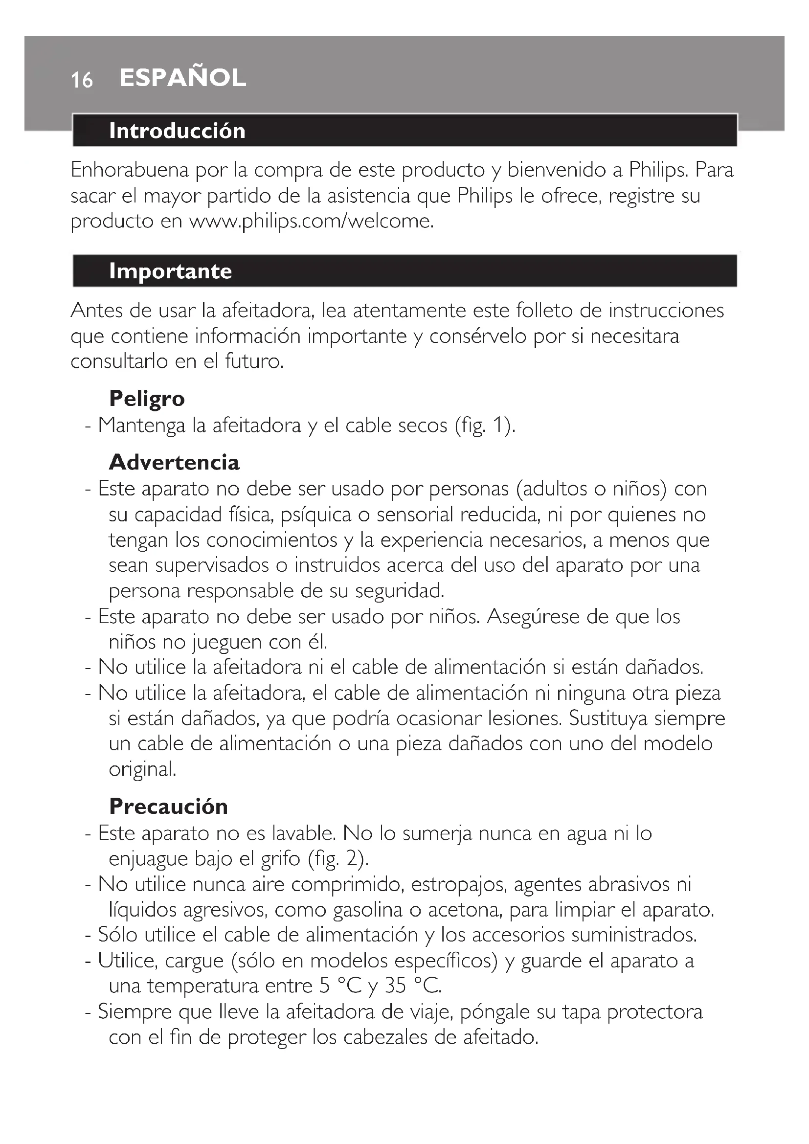 Introducción Enhorabuena por la compra de este producto y bienvenido a Philips. Para sacar el mayor partido de la asistencia que Philips le ofrece, registre su producto en www.philips.com/welcome. Importante Antes de usar la afeitadora, lea atentamente este folleto de instrucciones que contiene información importante y consérvelo por si necesitara consultarlo en el futuro. Peligro - Mantenga la afeitadora y el cable secos (g. 1). Advertencia - Este aparato no debe ser usado por personas (adultos o niños) con su capacidad física, psíquica o sensorial reducida, ni por quienes no tengan los conocimientos y la experiencia necesarios, a menos que sean supervisados o instruidos acerca del uso del aparato por una persona responsable de su seguridad. - Este aparato no debe ser usado por niños. Asegúrese de que los niños no jueguen con él. - No utilice la afeitadora ni el cable de alimentación si están dañados. - No utilice la afeitadora, el cable de alimentación ni ninguna otra pieza si están dañados, ya que podría ocasionar lesiones. Sustituya siempre un cable de alimentación o una pieza dañados con uno del modelo original. Precaución - Este aparato no es lavable. No lo sumerja nunca en agua ni lo enjuague bajo el grifo (g. 2). - No utilice nunca aire comprimido, estropajos, agentes abrasivos ni líquidos agresivos, como gasolina o acetona, para limpiar el aparato. - Sólo utilice el cable de alimentación y los accesorios suministrados. - Utilice, cargue (sólo en modelos especícos) y guarde el aparato a una temperatura entre 5 °C y 35 °C. - Siempre que lleve la afeitadora de viaje, póngale su tapa protectora con el n de proteger los cabezales de afeitado. ESPAÑOL- Si la afeitadora sufre un cambio brusco de temperatura, presión o humedad, deje que se aclimate durante 30 minutos antes de utilizarla. Cumplimiento de normas - Este aparato Philips cumple todos los estándares sobre campos electromagnéticos (CEM). Si se utiliza correctamente y de acuerdo con las instrucciones de este manual, los aparatos se puede usar de forma segura según los conocimientos cientícos disponibles hoy en día. General - El aparato está equipado con un selector automático de voltaje y es apto para voltajes de red entre 100 y 240 voltios. - Nivel de ruido máximo: Lc = 69 dB(A) Medio ambiente - Al nal de su vida útil, no tire el aparato junto con la basura normal del hogar. Llévelo a un punto de recogida ocial para su reciclado. De esta manera ayudará a conservar el medio ambiente (g. 3). - La batería recargable incorporada (sólo en modelos especícos) contiene sustancias que pueden contaminar el medio ambiente. Quite siempre la batería antes de deshacerse del aparato y de llevarlo a un punto de recogida ocial. Deposite la batería en un lugar de recogida ocial. Si no puede quitar la batería, puede llevar el aparato a un servicio de asistencia técnica de Philips, donde la extraerán y se desharán de ella de forma no perjudicial para el medio ambiente (g. 4). Extracción de la batería recargable (sólo en modelos especícos) Extraiga la batería únicamente cuando deseche la afeitadora. Asegúrese de que la batería esté completamente descargada cuando la extraiga del aparato. Tenga cuidado con las tiras de la batería ya que están aladas. ESPAÑOL 171 Compruebe si hay tornillos en la parte posterior de la afeitadora. Si es así, quítelos. 2 Retire la parte posterior o el panel frontal del aparato con un destornillador. Si es necesario, quite también los tornillos o piezas adicionales hasta que vea el circuito impreso con la batería recargable. 3 Extraiga la batería recargable. Garantía y servicio Si necesita información o tiene algún problema, visite la página Web de Philips en www.philips.com o póngase en contacto con el Servicio de Atención al Cliente de Philips en su país (hallará el número de teléfono en el folleto de la garantía mundial). Si no hay Servicio de Atención al Cliente de Philips en su país, diríjase a su distribuidor local Philips. Restricciones de la garantía Los cabezales de afeitado (cuchillas y protectores) no están cubiertos por las condiciones de la garantía internacional debido a que están sujetos a desgaste. ESPAÑOL1819 Johdanto Onnittelut ostoksestasi ja tervetuloa Philips-tuotteiden käyttäjäksi! Hyödynnä Philipsin tuki ja rekisteröi tuotteesi osoitteessa www.philips.com/welcome. Tärkeää Lue tämä opas huolellisesti ennen parranajokoneen ensimmäistä käyttökertaa ja säilytä se vastaisen varalle. Vaara - Älä kastele laitetta tai sen virtajohtoa (Kuva 1). Varoitus - Laitetta ei ole tarkoitettu lasten tai sellaisten henkilöiden käyttöön, joiden fyysinen tai henkinen toimintakyky on rajoittunut tai joilla ei ole kokemusta tai tietoa laitteen käytöstä, muuten kuin heidän turvallisuudestaan vastaavan henkilön valvonnassa ja ohjauksessa. - Laitetta ei ole tarkoitettu lasten käyttöön. Lasten ei saa antaa leikkiä laitteella. - Älä käytä laitetta, jos virtajohto tai pistoke on vahingoittunut. - Älä käytä parranajokonetta, virtajohtoa äläkä muuta osaa, jos se on vahingoittunut, koska se saattaa aiheuttaa vammoja. Vaihda vahingoittuneen virtajohdon tai osan tilalle aina alkuperäisen tyyppinen osa. Varoitus - Tätä parranajokonetta ei voi pestä. Älä koskaan upota sitä veteen äläkä huuhtele sitä vesihanan alla (Kuva 2). - Älä käytä paineilmaa, naarmuttavia tai syövyttäviä puhdistusaineita tai - välineitä laitteen puhdistamiseen (kuten bensiiniä tai asetonia). - Käytä vain mukana toimitettua virtajohtoa ja lisätarvikkeita. - Käytä, lataa (vain tietyt malli) ja säilytä laitetta 5 - 35 °C:n lämpötilassa. - Suojaa ajopäät matkoilla asettamalla suojus ajopäähän. - Jos parranajokone altistuu suurille lämpötilan, paineen tai kosteuden vaihteluille, anna sen mukautua 30 minuuttia ennen käyttöä. SUOMIVastaavuus standardien kanssa - Tämä Philips-laite vastaa kaikkia, sä