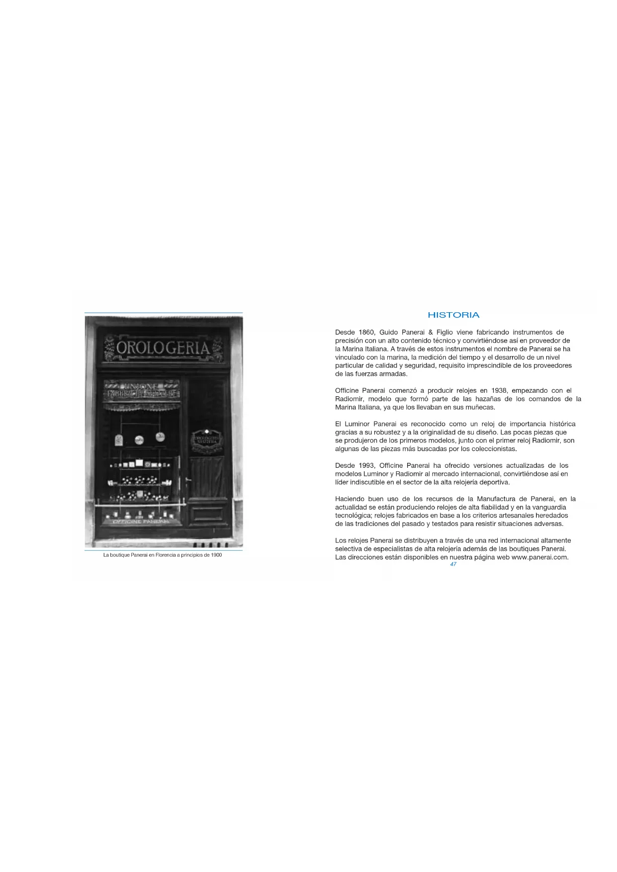 - Kontrolle der Ganggenauigkeit und weiterer Uhrwerksfunktionen AUSSENINSPEKTION Für alle oben nicht genannten Arbeiten (zum Beispiel Arbeiten am Metall- oder Lederarmband, an der Schließe, Austausch der drehbaren Lunette etc.), wenden Sie sich bitte direkt an einen autorisierten Panerai Kundendienst. Officine Panerai behält sich das Recht vor, jederzeit und ohne Vorankündigung die Liste der angebotenen Serviceleistungen und/oder ihren Inhalt zu ändern. PAA01409 Libretto 02-14.qxp_PAA01409 06/03/14 10:12 Pagina 4447 HISTORIA Desde 1860, Guido Panerai & Figlio viene fabricando instrumentos de precisión con un alto contenido técnico y convirtiéndose así en proveedor de la Marina Italiana. A través de estos instrumentos el nombre de Panerai se ha vinculado con la marina, la medición del tiempo y el desarrollo de un nivel particular de calidad y seguridad, requisito imprescindible de los proveedores de las fuerzas armadas. Officine Panerai comenzó a producir relojes en 1938, empezando con el Radiomir, modelo que formó parte de las hazañas de los comandos de la Marina Italiana, ya que los llevaban en sus muñecas. El Luminor Panerai es reconocido como un reloj de importancia histórica gracias a su robustez y a la originalidad de su diseño. Las pocas piezas que se produjeron de los primeros modelos, junto con el primer reloj Radiomir, son algunas de las piezas más buscadas por los coleccionistas. Desde 1993, Officine Panerai ha ofrecido versiones actualizadas de los modelos Luminor y Radiomir al mercado internacional, convirtiéndose así en líder indiscutible en el sector de la alta relojería deportiva. Haciendo buen uso de los recursos de la Manufactura de Panerai, en la actualidad se están produciendo relojes de alta fiabilidad y en la vanguardia tecnológica; relojes fabricados en base a los criterios artesanales heredados de las tradiciones del pasado y testados para resistir situaciones adversas. Los relojes Panerai se distribuyen a través de una red internacional altamente selectiva de especialistas de alta relojería además de las boutiques Panerai. Las direcciones están disponibles en nuestra página web www.panerai.com. La boutique Panerai en Florencia a principios de 1900 PAA01409 Libretto 02-14.qxp_PAA01409 06/03/14 10:12 Pagina 4649