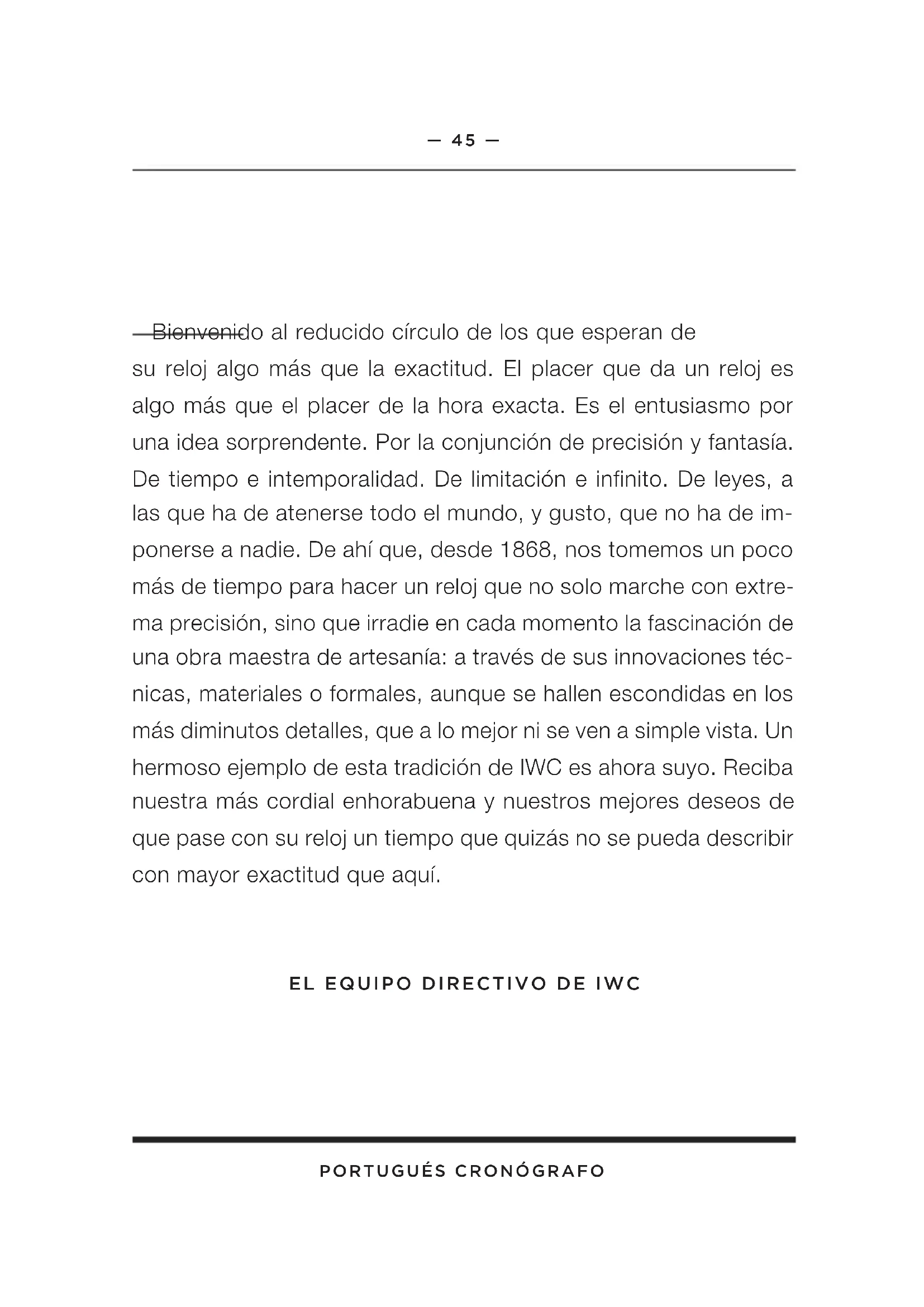 —Bienvenido al reducido circulo de los que esperan de su reloj algo más que la exactitud. El placer que da un reloj es algo más que el placer de la hora exacta. Es el entusiasmo por una idea sorpendente. Por la conjunción de precision y fantasía. De tiempo e intertemporalidad. De limitación e infinito. De leyes, a las que ha de atenerse todo el mundo, y gusto, que no ha de imponerse a nadie. De ahí que, desde 1868, nos tomosos un poco más de tiempo para hacer un reloj que no solo marche con extremaprecision, sino que irradie en cada momento la fascinación de unateachersma maestra de artesanía: a工程技术 de sus innovaciones技术水平as, materiales o formales, excepta se hallen escondidas en los más diminutos detailles, que a lo mejor ni se ven a simple vista. Un hermoso ejemplo de esta tradicción de IwC es ahora suyo. Reciba nuestra más cordialEnhorabuena y nuestros migliorores deseos de que pase con su reloj un tiempo que quizás no se pueda describir con mayor exactitud queAquí.