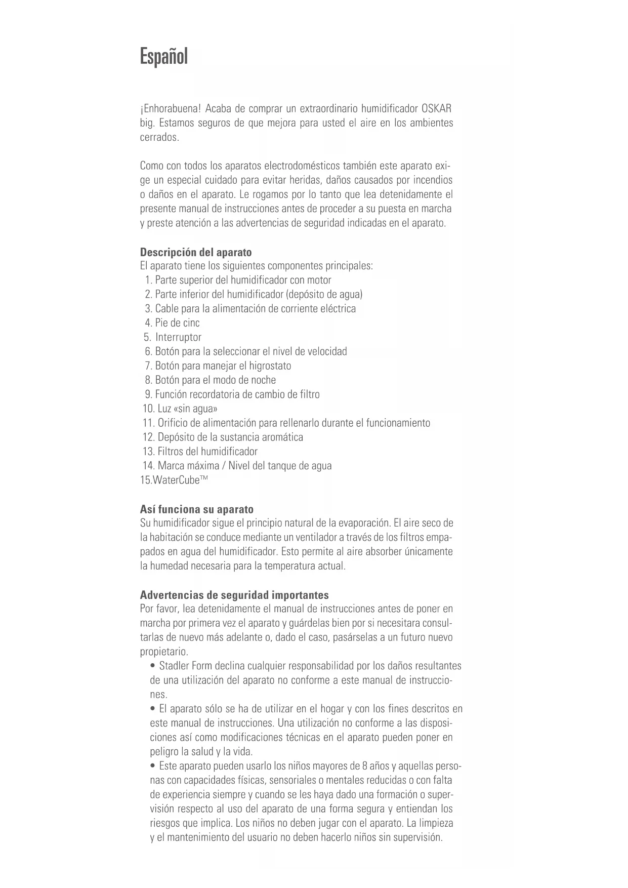 Dimensioni 470 x 290 x 200 mm (larghezza x altezza x profondità) Peso 4.7 kg Capacità serbatoio 6 litri Rumorosità 25 – 46 dB(A) Conforme con i regolamenti UE CE / RAEE / RoHS / EAC Tutti i diritti relativi a qualsiasi modifica tecnica sono riservatiEspañol ¡Enhorabuena! Acaba de comprar un extraordinario humidificador OSKAR big. Estamos seguros de que mejora para usted el aire en los ambientes cerrados. Como con todos los aparatos electrodomésticos también este aparato exi- ge un especial cuidado para evitar heridas, daños causados por incendios o daños en el aparato. Le rogamos por lo tanto que lea detenidamente el presente manual de instrucciones antes de proceder a su puesta en marcha y preste atención a las advertencias de seguridad indicadas en el aparato. Descripción del aparato El aparato tiene los siguientes componentes principales: