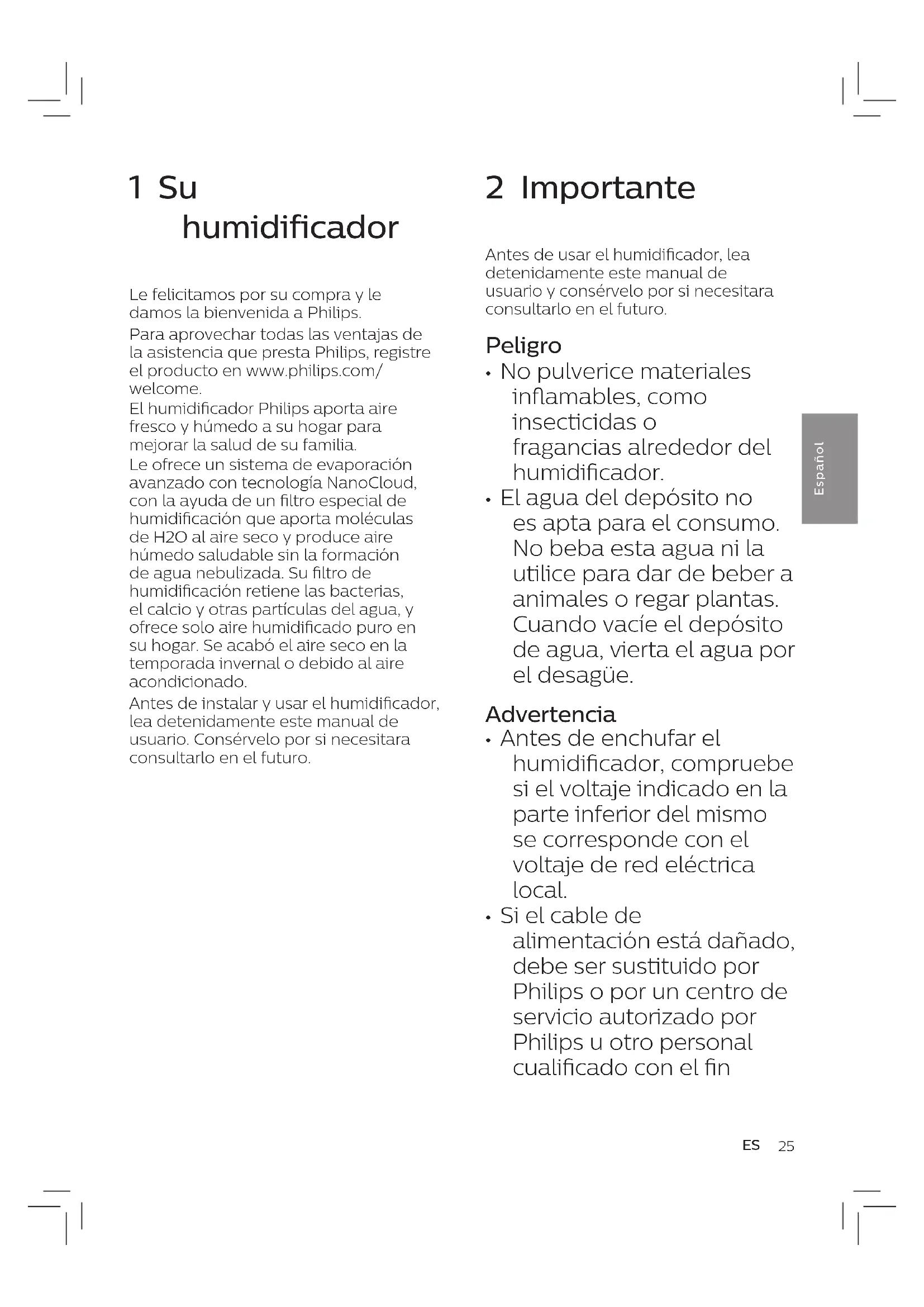 1 Su humidificador Le felicitamos por su compra y le damos la bienvenida a Philips. Para aprovechar todas las ventajas de la asistencia que presta Philips, registre el producto en www.philips.com/ welcome. El humidicador Philips aporta aire fresco y húmedo a su hogar para mejorar la salud de su familia. Le ofrece un sistema de evaporación avanzado con tecnología NanoCloud, con la ayuda de un ltro especial de humidicación que aporta moléculas de H2O al aire seco y produce aire húmedo saludable sin la formación de agua nebulizada. Su ltro de humidicación retiene las bacterias, el calcio y otras partículas del agua, y ofrece solo aire humidicado puro en su hogar. Se acabó el aire seco en la temporada invernal o debido al aire acondicionado. Antes de instalar y usar el humidicador, lea detenidamente este manual de usuario. Consérvelo por si necesitara consultarlo en el futuro. 2 Importante Antes de usar el humidicador, lea detenidamente este manual de usuario y consérvelo por si necesitara consultarlo en el futuro. Peligro