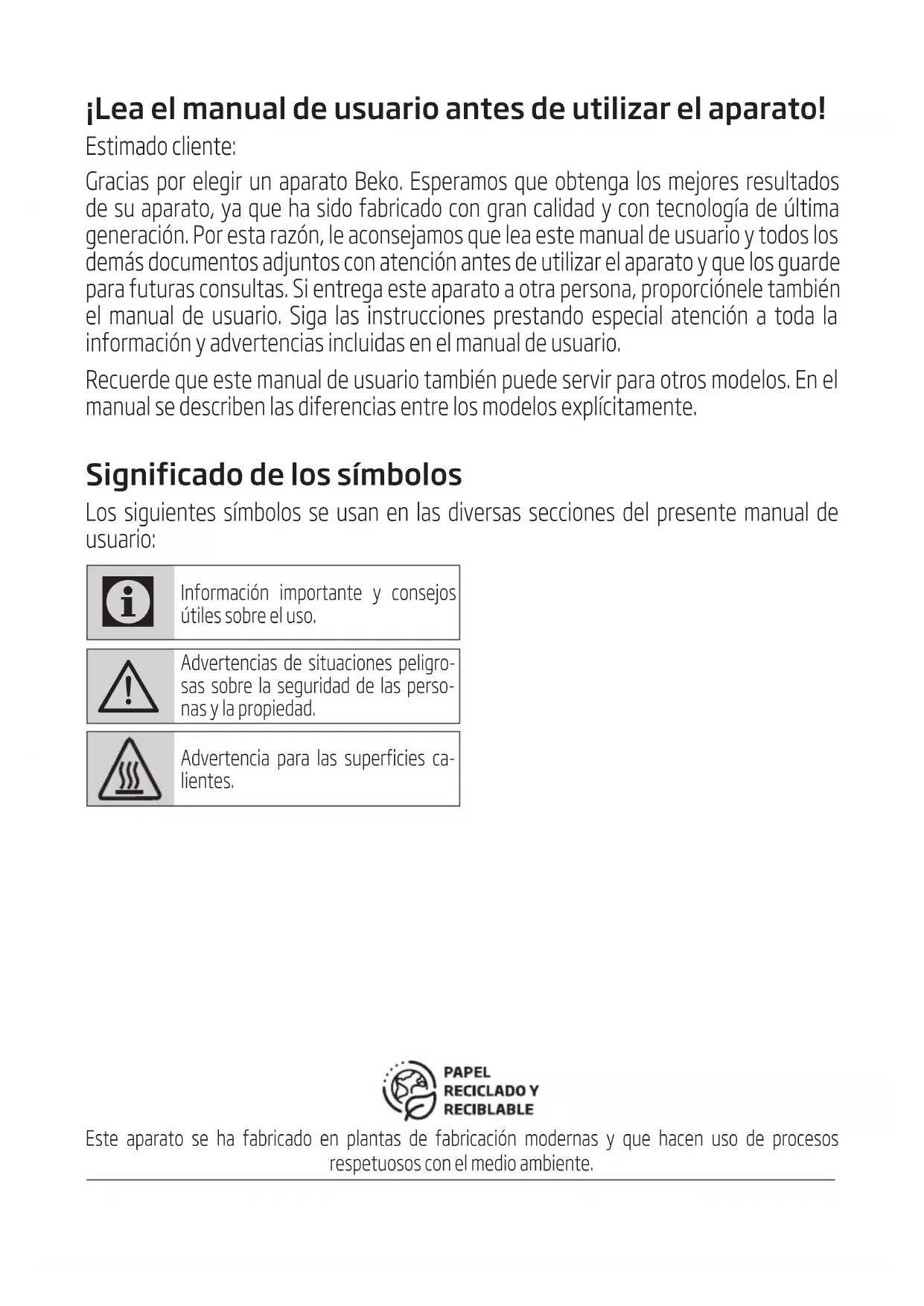 Prima di contattare l’assistenza tecnica, al ne di agevolare la gestione della chiamata, è necessario avere a portata di mano il modello del prodotto e il documento scale di acquisto.¡Lea el manual de usuario antes de utilizar el aparato! Estimado cliente: Gracias por elegir un aparato Beko. Esperamos que obtenga los mejores resultados de su aparato, ya que ha sido fabricado con gran calidad y con tecnología de última generación. Por esta razón, le aconsejamos que lea este manual de usuario y todos los demás documentos adjuntos con atención antes de utilizar el aparato y que los guarde para futuras consultas. Si entrega este aparato a otra persona, proporciónele también el manual de usuario. Siga las instrucciones prestando especial atención a toda la información y advertencias incluidas en el manual de usuario. Recuerde que este manual de usuario también puede servir para otros modelos. En el manual se describen las diferencias entre los modelos explícitamente. Significado de los símbolos Los siguientes símbolos se usan en las diversas secciones del presente manual de usuario: