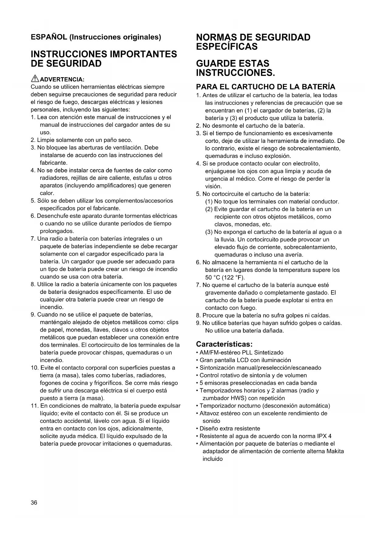 - Nunca utilice gasolina, benceno, disolvente, alcohol o un producto similar. Se puede provocar una decoloración, una deformación o grietas. Especificaciones: Requisitos de alimentación Adaptador de alimentación CA CC 12 V 700 mA, clavija central positiva Batería UM-3 (tamaño AA) x 2 para respaldo Grupo de baterías 7,2 V - 18 V Batería deslizante 9,6 V - 18 V41 Cobertura de frecuencias FM 87,50 - 108 MHz (0,05 MHz/paso) AM (MW) 522 - 1.629 kHz (9 kHz/paso) Características del circuito Altavoz 3 pulgadas 8 ohmios Potencia de salida 7,2 V: 0,5 W x 2, 9,6 V: 1 W x 2 10,8 V: 1,2 W x 2, 12 V: 1,5 W x 2 14,4 V: 2,2 W x 2, 18 V: 3,5 W x 2 Terminal de entrada 3,5 mm de diámetro (AUX IN1/ AUX IN2) Sistema de antena FM: antena de varilla flexible AM: antena de varilla Dimensiones (An x Al x Pr) en mm 280 x 302 x 163 Peso (sin batería) 4,0 kg42 PORTUGUÊS (Instruções de origem)