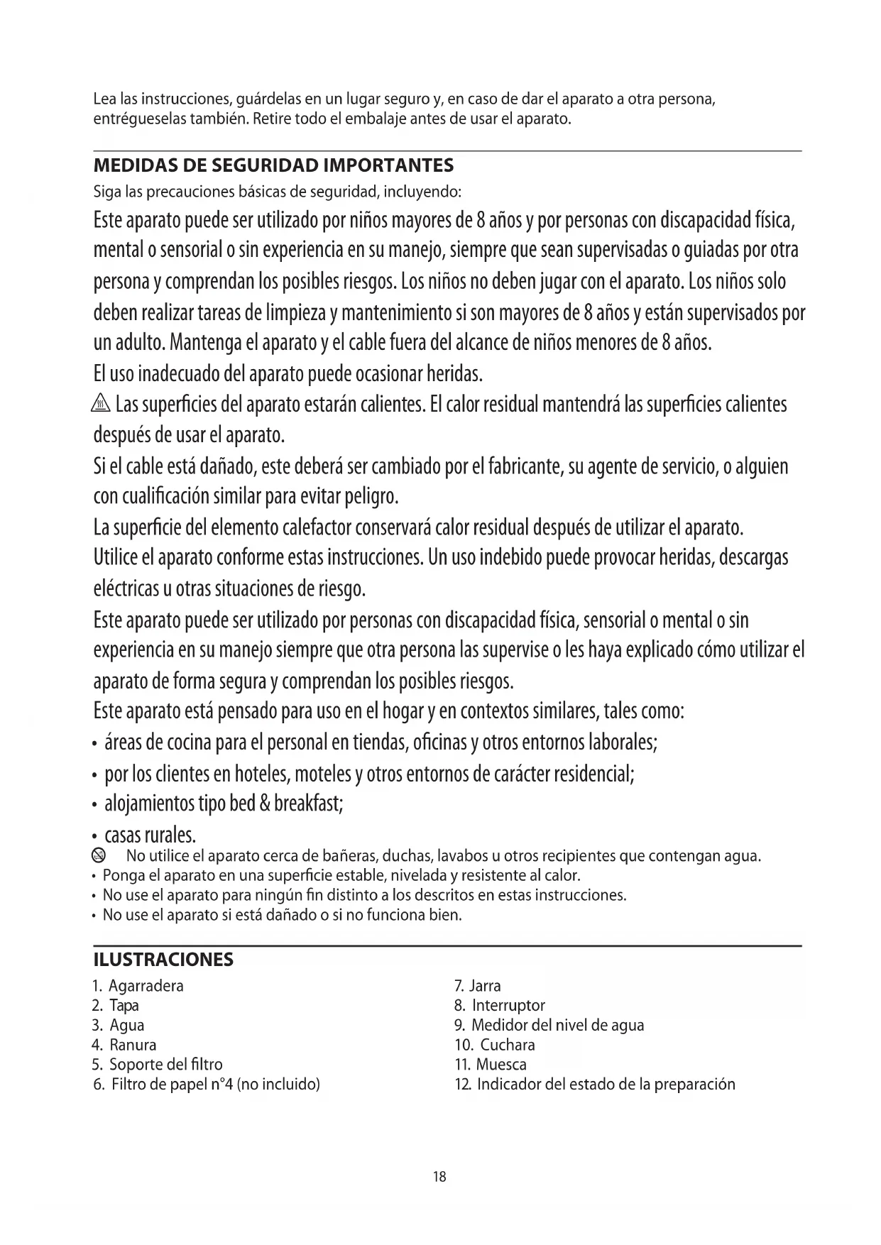 Siga las precauciones básicas de seguridad, incluyendo: Este aparato puede ser utilizado por niños mayores de 8 años y por personas con discapacidad física, mental o sensorial o sin experiencia en su manejo, siempre que sean supervisadas o guiadas por otra persona y comprendan los posibles riesgos. Los niños no deben jugar con el aparato. Los niños solo deben realizar tareas de limpieza y mantenimiento si son mayores de 8 años y están supervisados por un adulto. Mantenga el aparato y el cable fuera del alcance de niños menores de 8 años. El uso inadecuado del aparato puede ocasionar heridas. h Las superficies del aparato estarán calientes. El calor residual mantendrá las superficies calientes después de usar el aparato. Si el cable está dañado, este deberá ser cambiado por el fabricante, su agente de servicio, o alguien con cualificación similar para evitar peligro. La superficie del elemento calefactor conservará calor residual después de utilizar el aparato. Utilice el aparato conforme estas instrucciones. Un uso indebido puede provocar heridas, descargas eléctricas u otras situaciones de riesgo. Este aparato puede ser utilizado por personas con discapacidad física, sensorial o mental o sin experiencia en su manejo siempre que otra persona las supervise o les haya explicado cómo utilizar el aparato de forma segura y comprendan los posibles riesgos. Este aparato está pensado para uso en el hogar y en contextos similares, tales como: