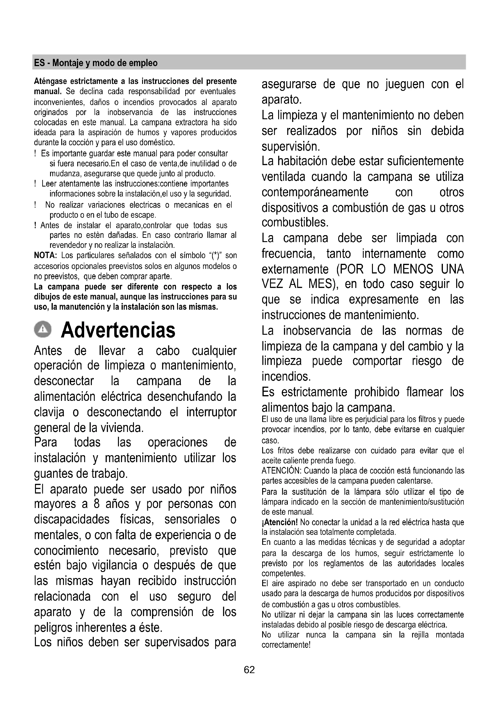 Onderhoud Schoonmaak Gebruik voor het reinigen UITSLUITEND een doek die u vochtig maakt met een beetje neutraal vloeibaar reinigingsmiddel. GEBRUIK GEEN GEREEDSCHAPPEN OF INSTRUMENTEN OM TE REINIGEN! Gebruik geen producten die schuurmiddelen bevatten. GEEN ALCOHOL GEBRUIKEN! Vetfilter afb. 28-29-30 Houdt de vetdeeltjes vast. De filter moet minstens een keer per maand worden gereinigd (of wanneer het systeem aangeeft dat de filters verzadigd zijn - indien dit voorzien is bij het model dat u bezit) met niet- agressieve detergenten, in de vaatwasmachine op lage temperaturen en met een korte cyclus. (Max.t°: 70°C) Wanneer de filter in de vaatwasmachine wordt gereinigd, kunnen de metalen delen verkleuren. De filter moet gedurende een uur in een oven worden gedroogd op een temperatuur van max. 100°C; indien de filter daarna nog vochtig blijkt, moet u de handeling herhalen. Vervang de filter minstens iedere 2 jaar. Aandacht! Na het onderhoud van de filter moet u EERST de vetfilter in de voorziene houder installeren en DAARNA de koolstoffilter. U kunt deze laatste filter herkennen omdat die in een kousje zit. Wanneer de houder eenmaal is teruggeplaatst, moet u controleren of enkel de vetfilter zichtbaar is. Koolstoffilter (alleen voor filterend apparaat) afb. 28-29-30 Houdt de lastige kookgeuren vast. Aandacht! U kunt de actieve koolstoffilter herkennen omdat die in een speciaal kousje zit. Wanneer u de demontage, het onderhoud en de reiniging van de filter uitvoert, moet u de filter met de grootste zorg hanteren zodat die niet beschadigd raakt en zodat het kousje niet wordt geopend. Het koolstoffilter kan om de twee maanden gewassen worden (of als de filter verzadiging indicatie – indien aanwezig op het model in Uw bezit – deze noodzaak aangeeft) in warm water en met geschikte reinigingsmiddelen of in de vaatwasmachine op 65°C (in het geval van een reiniging in de vaatwasmachine voer een volledige wascyclus uit zonder vaten). Verwijder het overtollige water zonder het filter te beschadigen, daarna het matje 10 minuten lang in de oven op 100°C doen om het goed te drogen. Vervang het matje om de 3 jaar en elke keer dat het beschadigd blijkt. Aandacht! Na het onderhoud van de filter moet u EERST de vetfilter in de voorziene houder installeren en DAARNA de koolstoffilter. U kunt deze laatste filter herkennen omdat die in een kousje zit. Wanneer de houder eenmaal is teruggeplaatst, moet u controleren of enkel de vetfilter zichtbaar is. Vervanging lampjes afb. 29 De kap is voorzien van een verlichtingssysteem gebaseerd op de LEDDEN technologie. De Ledden zorgen voor een optimale verlichting, voor een 10 maal langere tijdsduur ten opzichte van de traditionele lampjes en een elektriciteitsbesparing van wel 90%. Wendt u tot de technische assistentiedienst voor de aankoop van led's die vervangen moeten worden.62 ES - Montaje y modo de empleo Aténgase estrictamente a las instrucciones del presente manual. Se declina cada responsabilidad por eventuales inconvenientes, daños o incendios provocados al aparato originados por la inobservancia de las instrucciones colocadas en este manual. La campana extractora ha sido ideada para la aspiración de humos y vapores producidos durante la cocción y para el uso doméstico. ! Es importante guardar este manual para poder consultar si fuera necesario.En el caso de venta,de inutilidad o de mudanza, asegurarse que quede junto al producto. ! Leer atentamente las instrucciones:contiene importantes informaciones sobre la instalación,el uso y la seguridad. ! No realizar variaciones electricas o mecanicas en el producto o en el tubo de escape. ! Antes de instalar el aparato,controlar que todas sus partes no estèn dañadas. En caso contrario llamar al revendedor y no realizar la instalaciòn. NOTA: Los particulares señalados con el símbolo “(*)” son accesorios opcionales preevistos solos en algunos modelos o no preevistos, que deben comprar aparte. La campana puede ser diferente con respecto a los dibujos de este manual, aunque las instrucciones para su uso, la manutención y la instalación son las mismas. Advertencias Antes de llevar a cabo cualquier operación de limpieza o mantenimiento, desconectar la campana de la alimentación eléctrica desenchufando la clavija o desconectando el interruptor general de la vivienda. Para todas las operaciones de instalación y mantenimiento utilizar los guantes de trabajo. El aparato puede ser usado por niños mayores a 8 años y por personas con discapacidades físicas, sensoriales o mentales, o con falta de experiencia o de conocimiento necesario, previsto que estén bajo vigilancia o después de que las mismas hayan recibido instrucción relacionada con el uso seguro del aparato y de la comprensión de los peligros inherentes a éste. Los niños deben ser supervisados para asegurarse de que no jueguen con el aparato. La limpieza y el mantenimiento no deben ser realizados por niños sin debida supervisión. La habitación debe estar suficientemente ventilada cuando la campana se utiliza contemporáneamente con otros dispositivos a combustión de gas u otros combustibles. La campana debe ser limpiada con frecuencia, tanto internamente como externamente (POR LO MENOS UNA VEZ AL MES), en todo caso seguir lo que se indica expresamente en las instrucciones de mantenimiento. La inobservancia de las normas de limpieza de la campana y del cambio y la limpieza puede comportar riesgo de incendios. Es estrictamente prohibido flamear los alimentos bajo la campana. El uso de una llama libre es perjudicial para los filtros y puede provocar incendios, por lo tanto, debe evitarse en cualquier caso. Los fritos debe realizarse con cuidado para evitar que el aceite caliente prenda fuego. ATENCIÓN: Cuando la placa de cocción está funcionando las partes accesibles de la campana pueden calentarse. Para la sustitución de la lámpara sólo utilizar el tipo de lámpara indicado en la sección de mantenimiento/sustitución de este manu