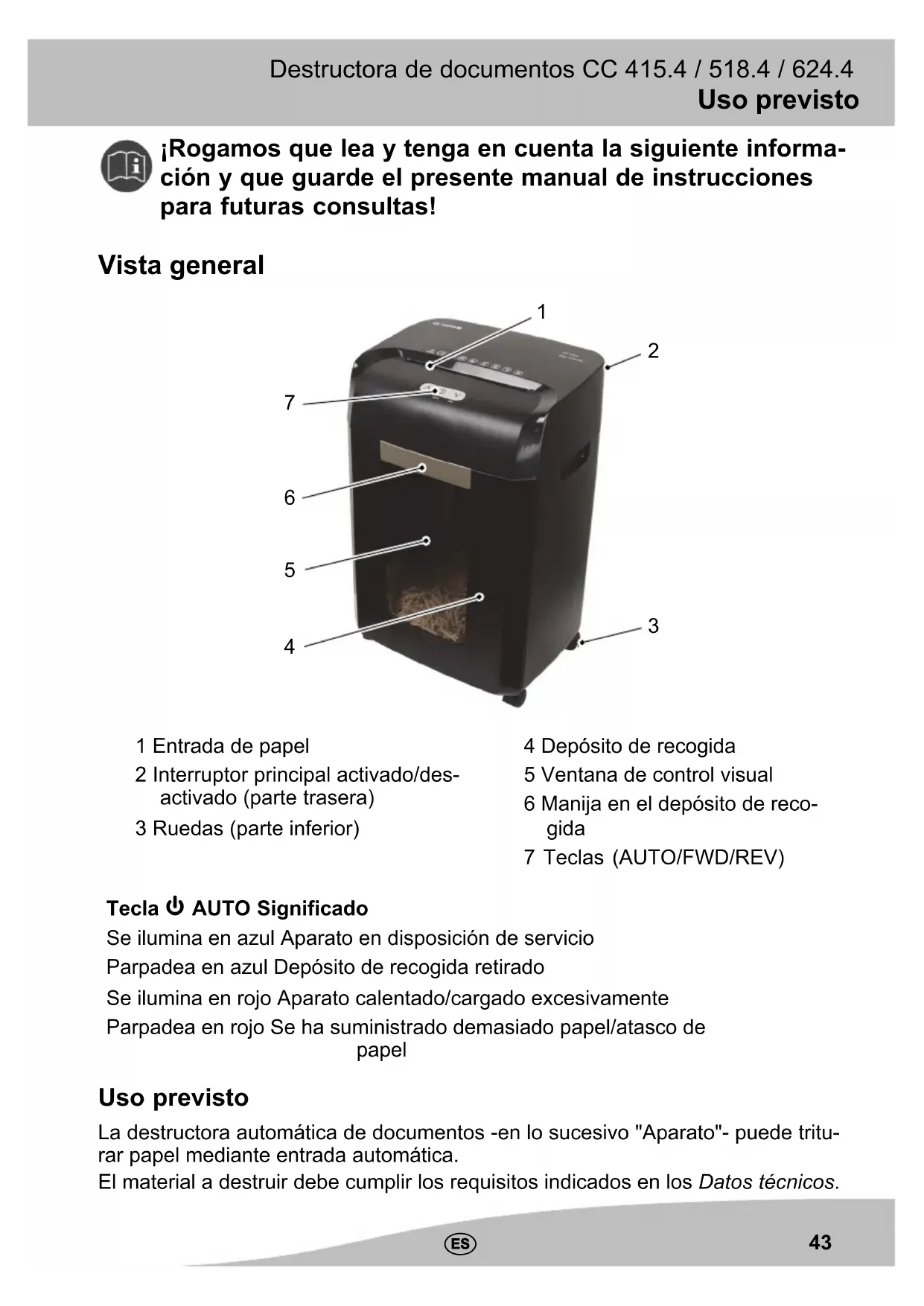 1 Entrada de papel 2 Interruptor principal activado/des activado (parte trasera) 3 Ruedas (parte inferior) 4 Depósito de recogida 5 Ventana de control visual 6 Manija en el depósito de reco gida 7 Teclas (AUTO/FWD/REV) Tecla AUTO Significado Se ilumina en azul Aparato en disposición de servicio Parpadea en azul Depósito de recogida retirado Se ilumina en rojo Aparato calentado/cargado excesivamente Parpadea en rojo Se ha suministrado demasiado papel/atasco de papel Uso previsto La destructora automática de documentos -en lo sucesivo "Aparato"- puede tritu rar papel mediante entrada automática. El material a destruir debe cumplir los requisitos indicados en los Datos técnicos.Advertencias de seguridad Destructora de documentos CC 415.4 / 518.4 / 624.4