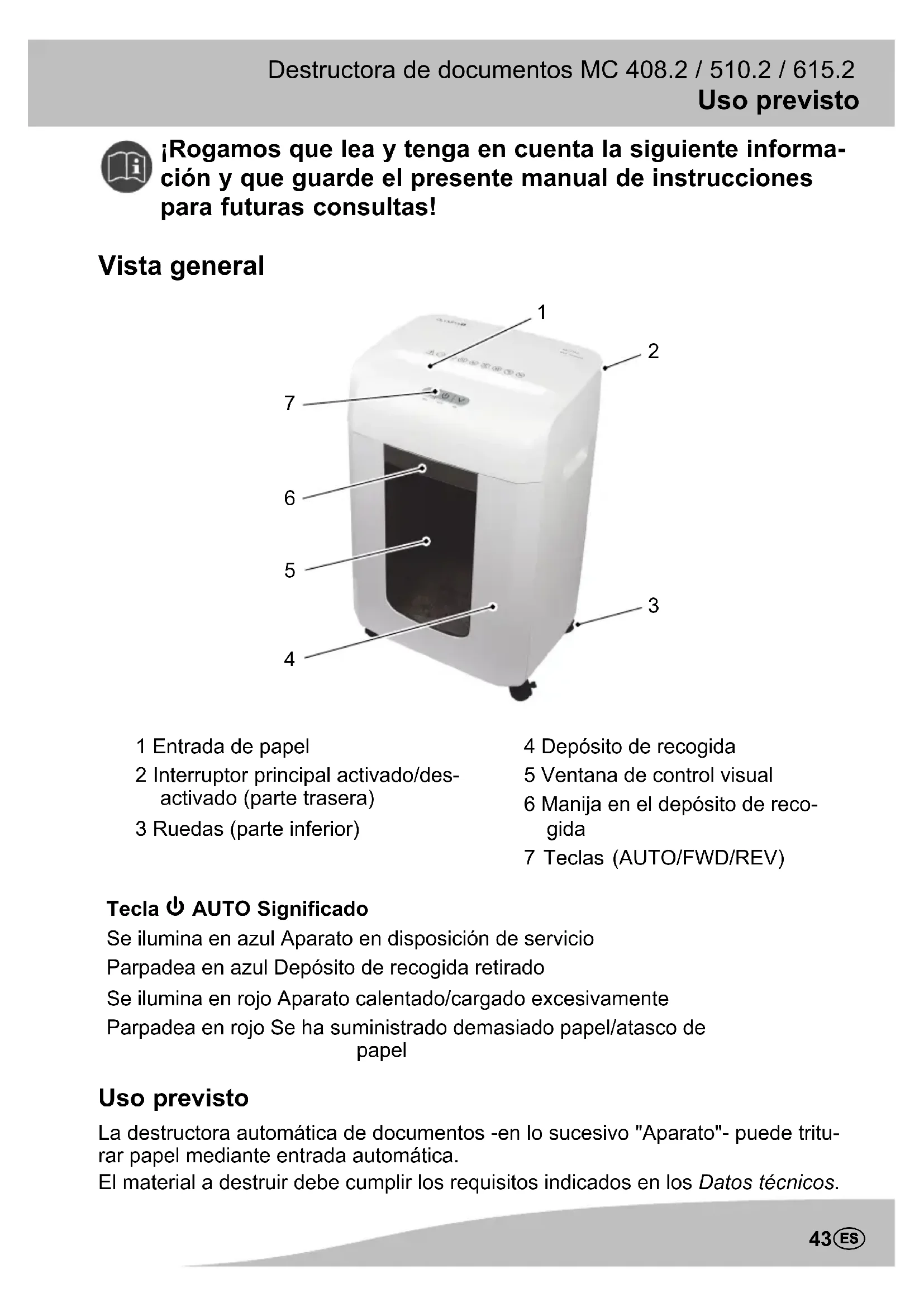 1 Entrada de papel 2 Interruptor principal activado/des activado (parte trasera) 3 Ruedas (parte inferior) 4 Depósito de recogida 5 Ventana de control visual 6 Manija en el depósito de reco gida 7 Teclas (AUTO/FWD/REV) Tecla AUTO Significado Se ilumina en azul Aparato en disposición de servicio Parpadea en azul Depósito de recogida retirado Se ilumina en rojo Aparato calentado/cargado excesivamente Parpadea en rojo Se ha suministrado demasiado papel/atasco de papel Uso previsto La destructora automática de documentos -en lo sucesivo "Aparato"- puede tritu rar papel mediante entrada automática. El material a destruir debe cumplir los requisitos indicados en los Datos técnicos.Advertencias de seguridad Destructora de documentos MC 408.2 / 510.2 / 615.2 44 E Se prohíbe expresamente cualquier modificación o transformación del aparato por cuenta propia. Jamás abra el aparato y tampoco intente repararlo por su cuenta. Uso no conforme al objetivo previsto La destructora automática de documentos no sirve para triturar material que no cumpla los requisitos indicados en los Datos técnicos (por ejemplo, cartón). Cualquier otro uso diferente a la descripción en Uso previsto se considera como no conforme al objetivo previsto. Advertencias de seguridad Las siguientes advertencias de seguridad tienen validez para todo el documento. Lea y tenga en cuenta las advertencias de seguridad para protegerse a sí mismo y al medio ambiente.
