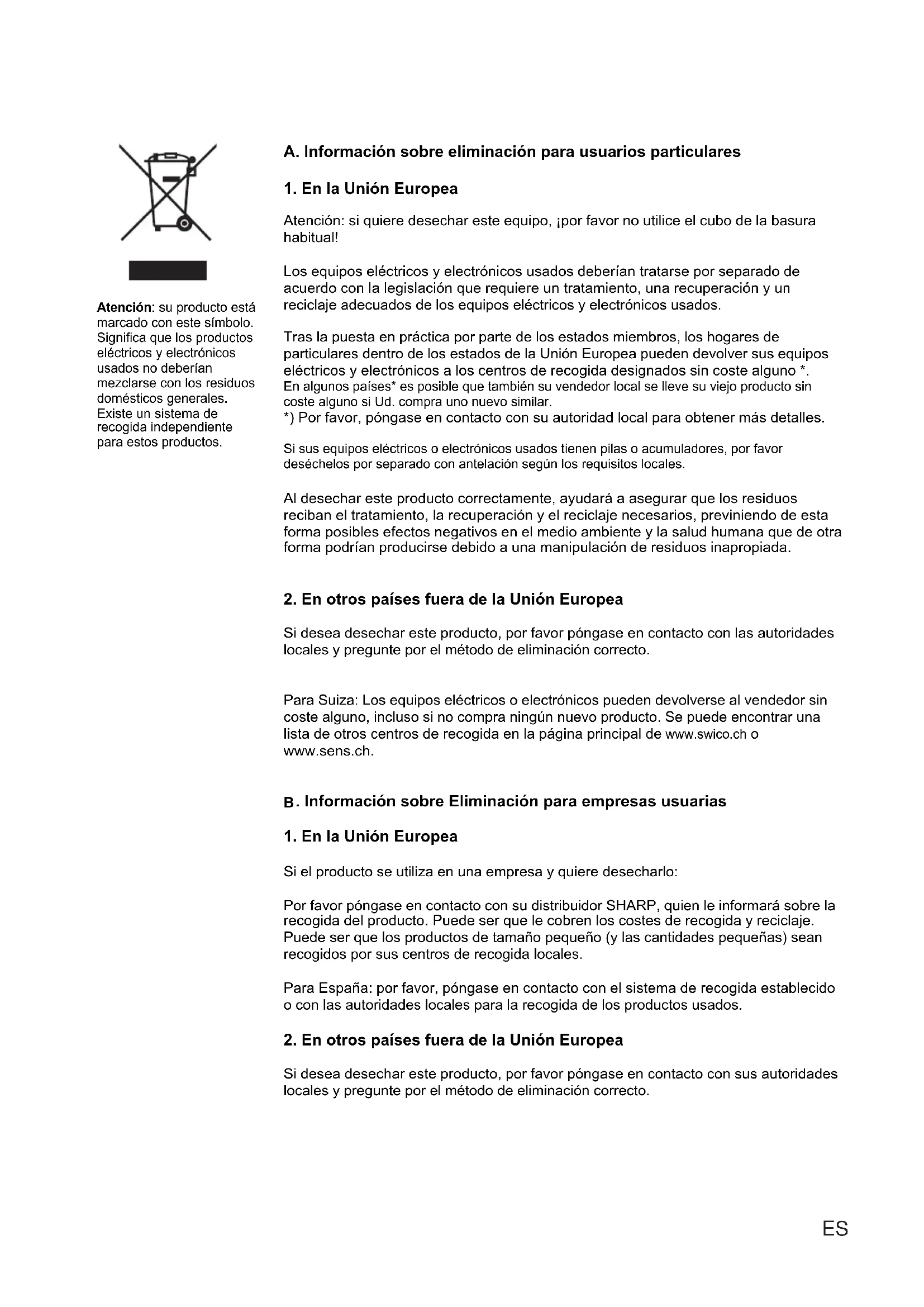 Si el producto se utiliza en una empresa y quiere desecharlo: Por favor póngase en contacto con su distribuidor SHARP, quien le informará sobre la recogida del producto. Puede ser que le cobren los costes de recogida y reciclaje. Puede ser que los productos de tamaño pequeño (y las cantidades pequeñas) sean recogidos por sus centros de recogida locales. Para España: por favor, póngase en contacto con el sistema de recogida establecido o con las autoridades locales para la recogida de los productos usados.