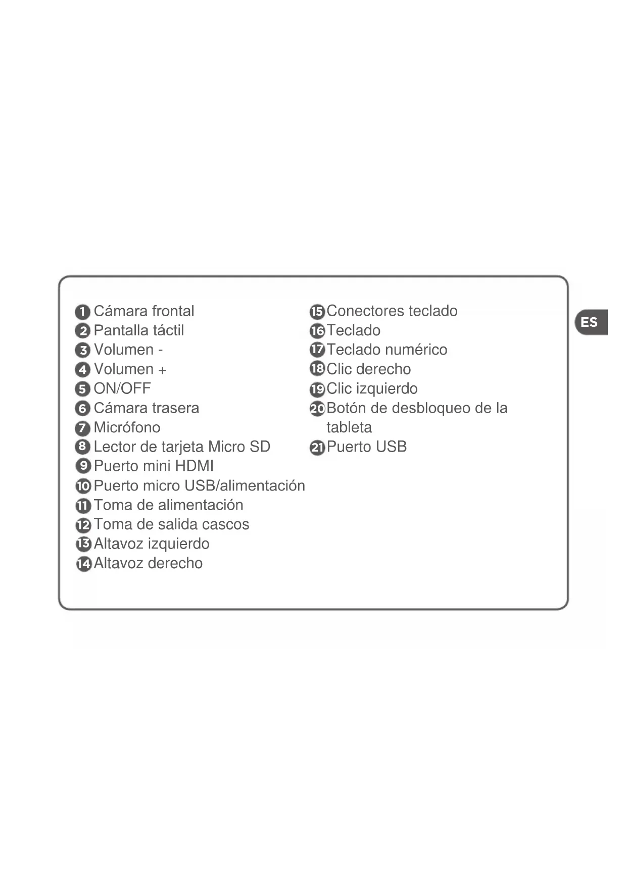 Cámara frontal Pantalla táctil Volumen - Volumen + ON/OFF Cámara trasera Micrófono Lector de tarjeta Micro SD Puerto mini HDMI Puerto micro USB/alimentación Toma de alimentación Toma de salida cascos Altavoz izquierdo Altavoz derecho Conectores teclado Teclado Teclado numérico Clic derecho Clic izquierdo Botón de desbloqueo de la tableta Puerto USB