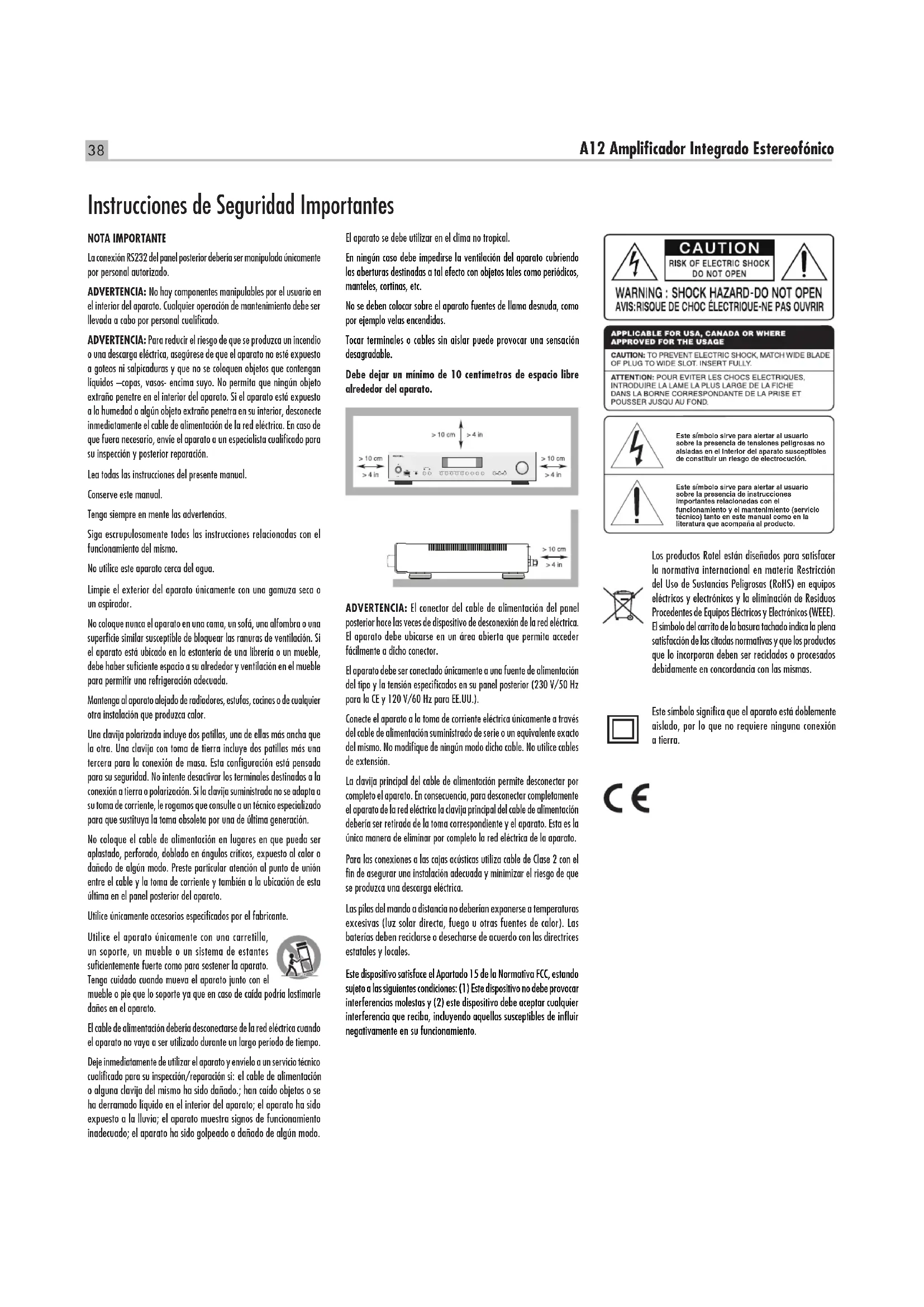 Menú de Ajustes (“Settings”) .........................................45 Problemas y Posibles Soluciones .......................................47 El Indicador Luminoso de Puesta en Marcha No Se Activa 47 Sustitución del Fusible 47 No Hay Sonido 47 Formatos de Audio Compatibles 47 No Se Puede Establecer Conexión Vía Bluetooth 47 Características Técnicas .............................................4840 A12 Amplicador Integrado Estereofónico Para Empezar Gracias por haber adquirido el Amplificador Integrado Estereofónico Rotel A12. Utilizado en un sistema de reproducción musical de alta calidad, le permitirá disfrutar durante muchos años de sus composiciones musicales favoritas. Su nuevo amplificador es un componente de audio de altas prestaciones extremadamente completo. Todos los aspectos de su diseño han sido optimizados para preservar toda la gama dinámica y todas las sutilezas de su música favorita. El aparato incorpora una fuente de alimentación altamente regulada que incluye un transformador de alimentación toroidal diseñado y construido a medida siguiendo especificaciones de Rotel. Esta fuente de alimentación de baja impedancia posee una generosa reserva de energía que permite al amplificador reproducir fácilmente las más exigentes señales de audio. Un diseño de este tipo resulta más caro de fabricar pero es mejor para la música. Las placas de circuito impreso de este amplificador Rotel incorporan Pistas Circuitales Simétricas con el fin de asegurar el perfecto mantenimiento de las relaciones temporales de la música y la más fiel reproducción posible de las mismas. Por su parte, la circuitería interna utiliza resistencias de película metálica y condensadores de poliestireno o polipropileno en los puntos más críticos del recorrido de la señal de audio. Todos los aspectos de este diseño han sido examinados al milímetro con el objetivo último de conseguir una fiel reproducción de la música. Las principales funciones del A12 son fáciles de instalar y usar. Si usted ya está experimentado en el manejo de componentes de audio estereofónicos, en principio no debería encontrar nada que le resultara especialmente complicado. Basta con que conecte el resto de componentes de su equipo y disfrute con su música preferida. Algunas Precauciones ADVERTENCIA: Para evitar que se produzcan daños potenciales en su equipo, que desconecte TODOS del mismo cuando conecte o desconecte las cajas acústicas o cualquier otro elemento del mismo. No vuelva a poner en marcha el equipo hasta que esté seguro de que todas las conexiones hayan sido correctamente ejecutadas. Preste particular atención a los cables de conexión a las cajas acústicas, procurando que no haya conductores sueltos de uno de ellos que puedan tocar los cables correspondientes a otras cajas acústicas del equipo o el chasis del amplificador. Le rogamos que lea cuidadosamente el presente manual de instrucciones. Además de las instrucciones básicas de instalación y puesta a punto del A12, incluye información de gran valor sobre las diferentes configuraciones que permite el aparato, así como información general que le ayudará a optimizar las prestaciones de su sistema. Le rogamos asimismo que contacte con su distribuidor autorizado de Productos Rotel para cualquier duda o consulta. No le quepa la menor duda de que todos sus comentarios y observaciones serán bien recibidos. Guarde el embalaje del aparato y todo el material en él contenido para un posible uso futuro del mismo. El embalaje o transporte del amplificador en condiciones diferentes de las originales puede dañar seriamente el aparato. Si se incluye en la casilla, complete la tarjeta de registro del propietario o regístrese en línea. Asegúrese asimismo de mantener en su poder la factura de compra puesto que es la mejor manera de que usted se acuerde de la fecha de compra, un dato esencial en caso de que necesitara asistencia técnica durante el período de garantía. Colocación Al igual que todos los componentes de audio que manejan señales de bajo nivel, este amplificador puede verse afectado por su entorno. Evite colocar el aparato encima de otros componentes. Evite asimismo situar los cables que transporten señales de audio cerca de los de alimentación ya que de este modo se minimizará la posibilidad de que se capten zumbidos o interferencias. El aparato genera calor como parte de su funcionamiento normal. Tanto los disipadores térmicos como las ranuras de ventilación de su cubierta superior han sido diseñados para evacuar este calor. Las ranuras de ventilación de la cubierta superior deben permanecer siempre despejadas. Debería haber unos 10 centímetros de espacio libre alrededor del chasis y una razonable circulación de aire a lo largo del lugar en que haya sido instalado el amplificador a fin de evitar el sobrecalentamiento de este último. Tenga igualmente en cuenta el peso del amplificador cuando seleccione una ubicación determinada para su instalación. Asegúrese por tanto de que la estantería o mueble elegido pueda soportarlo. Le recomendamos que instale el aparato en muebles diseñados específicamente para albergar componentes de audio. Dichos muebles están concebidos para reducir o suprimir vibraciones que pueden afectar negativamente a la calidad del sonido. Consulte a su distribuidor autorizado de productos Rotel para que le aconseje acerca de los muebles más adecuados para su equipo y sobre la adecuada instalación en los mismos de sus componentes de audio. Cables Asegúrese de que los cables de alimentación, digitales y de modulación de su equipo estén alejados entre sí ya que de este modo se minimizarán las posibilidades de que la señal de audio se vea afectada por ruido o interferencias procedentes de los cables digitales o de alimentación. El uso sistemático de cables apantallados de alta calidad también contribuirá a prevenir la entrada de ruido o interferencias susceptibles 