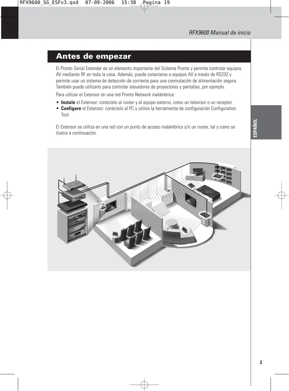 RFX9600 Manual de inicio Antes de empezar El Pronto Serial Extender es un elemento importante del Sistema Pronto y permite controlar equipos AV mediante RF en toda la casa. Además, puede conectarse a equipos AV a través de RS232 y permite usar un sistema de detección de corriente para una conmutación de alimentación segura. También puede utilizarlo para controlar elevadores de proyectores y pantallas, por ejemplo. Para utilizar el Extensor en una red Pronto Network inalámbrica: El Extensor se utiliza en una red con un punto de acceso inalámbrico y/o un router, tal y como se ilustra a continuación. ESPAÑOL