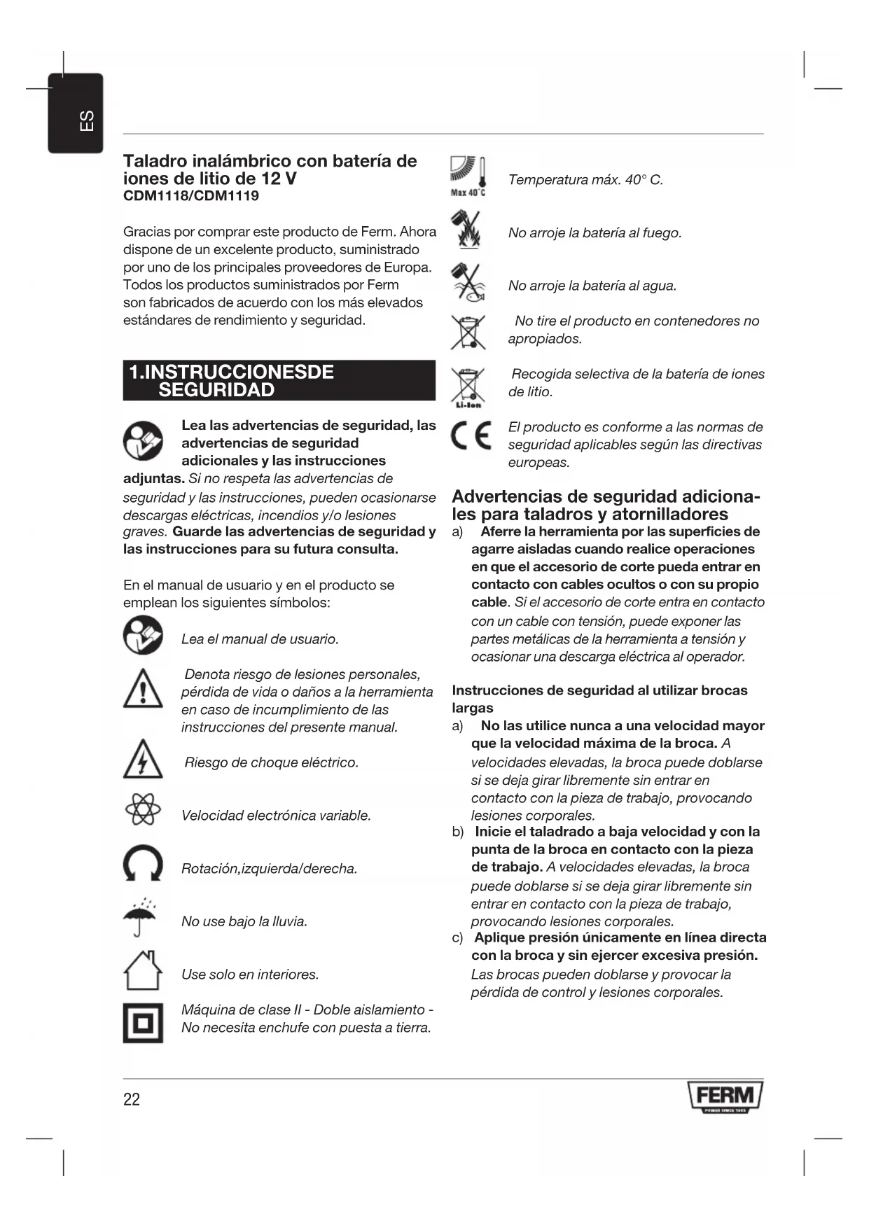 Taladro inalámbrico con batería de iones de litio de 12 V CDM1118/CDM1119 Gracias por comprar este producto de Ferm. Ahora dispone de un excelente producto, suministrado por uno de los principales proveedores de Europa. Todos los productos suministrados por Ferm son fabricados de acuerdo con los más elevados estándares de rendimiento y seguridad.