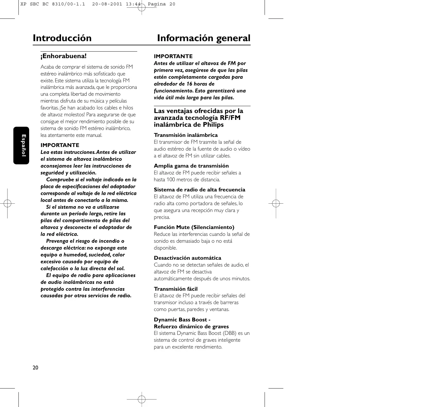 – Cambie solamente las pilas por pilas LR6/AA NiCd (preferiblemente Philips). – No deje el altavoz cerca de fuentes de calor. No los exponga a la luz directa del sol, polvo excesivo, humedad, lluvia o cualquier tipo de choque mecánico. – No utilice alcohol, solventes o sustancias con base de petróleo para limpiar el altavoz o el transmisor. Utilice una gamuza ligeramente húmeda para limpiar la caja. – No utilice agentes de limpieza que contengan alcohol, amoniaco o abrasivos ya que pueden dañar la caja.