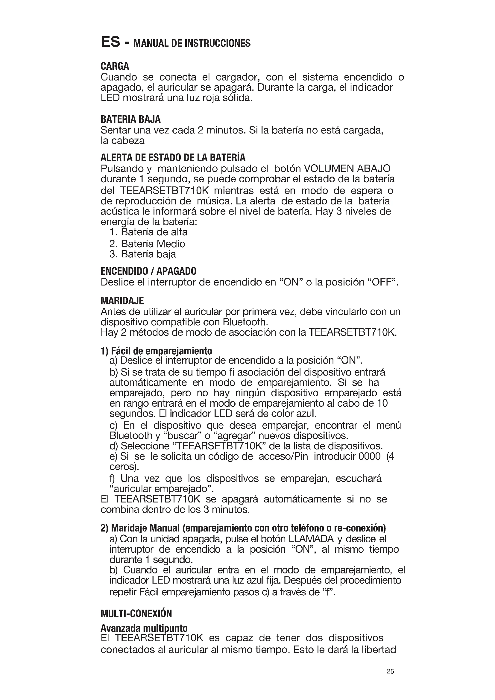 CARGA Cuando se conecta el cargador, con el sistema encendido o apagado, el auricular se apagará. Durante la carga, el indicador LED mostrará una luz roja sólida. BATERIA BAJA Sentar una vez cada 2 minutos. Si la batería no está cargada, la cabeza ALERTA DE ESTADO DE LA BATERÍA Pulsando y manteniendo pulsado el botón VOLUMEN ABAJO durante 1 segundo, se puede comprobar el estado de la batería del TEEARSETBT710K mientras está en modo de espera o de reproducción de música. La alerta de estado de la batería acústica le informará sobre el nivel de batería. Hay 3 niveles de energía de la batería: