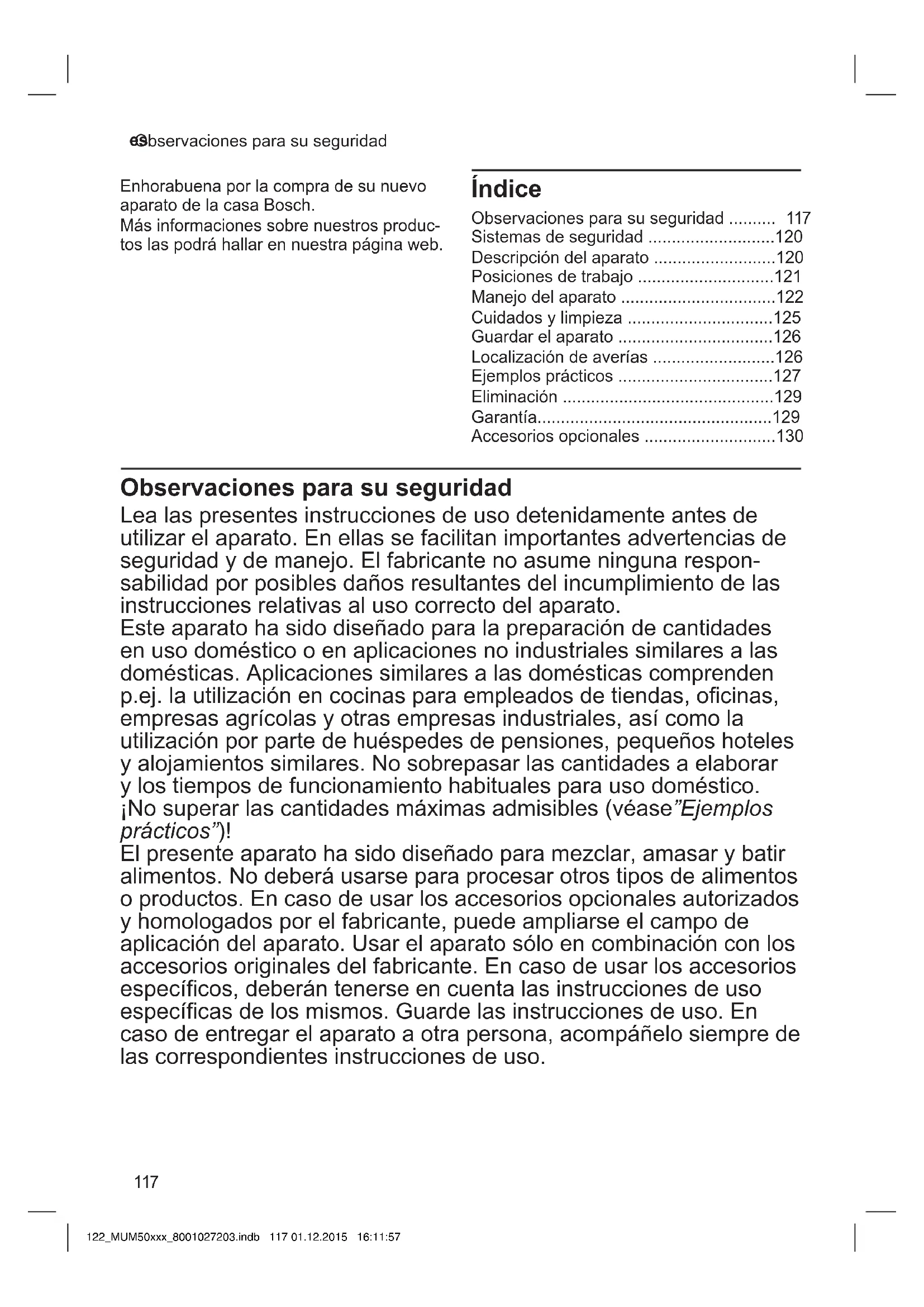 - Observacionesparasuseguridad Enhorabuenaporlacompradesunuevo aparatodelacasaBosch. Másinformacionessobrenuestrosproduc- toslaspodráhallarennuestrapáginaweb. Índice Observacionesparasuseguridad p. 117