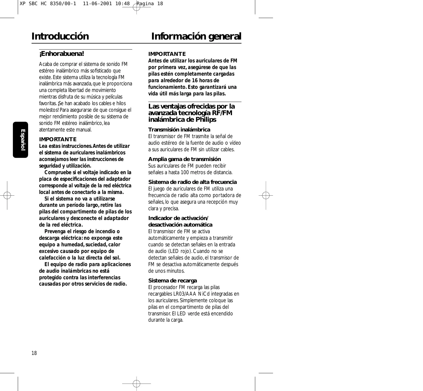 Acaba de comprar el sistema de sonido FM estéreo inalámbrico más sofisticado que existe. Este sistema utiliza la tecnología FM inalámbrica más avanzada, que le proporciona una completa libertad de movimiento mientras disfruta de su música y películas favoritas. ¡Se han acabado los cables e hilos molestos! Para asegurarse de que consigue el mejor rendimiento posible de su sistema de sonido FM estéreo inalámbrico, lea atentamente este manual. IMPORTANTE Lea estas instrucciones.Antes de utilizar el sistema de auriculares inalámbricos aconsejamos leer las instrucciones de seguridad y utilización. Compruebe si el voltaje indicado en la placa de especificaciones del adaptador corresponde al voltaje de la red eléctrica local antes de conectarlo a la misma. Si el sistema no va a utilizarse durante un período largo, retire las pilas del compartimento de pilas de los auriculares y desconecte el adaptador de la red eléctrica. Prevenga el riesgo de incendio o descarga eléctrica: no exponga este equipo a humedad, suciedad, calor excesivo causado por equipo de calefacción o la luz directa del sol. El equipo de radio para aplicaciones de audio inalámbricas no está protegido contra las interferencias causadas por otros servicios de radio.