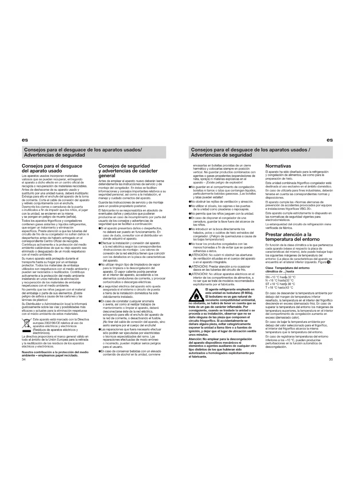 Clase Temperatura del entorno climática de ... hasta SN +10 °C hasta 32 °C N +16 °C hasta 32 °C ST +18 °C hasta 38 °C T +18 °C hasta 43 °C En caso de descender la temperatura ambiente por debajo del margen de temperatura inferior reseñado, la temperatura en el interior del frigorífico desciende en exceso (demasiado frío). En caso de superar la temperatura del entorno los márgenes de temperatura superiores, la temperatura en el interior del compartimento de congelación aumenta en exceso (demasiado calor). En caso de bajar la temperatura ambiente por debajo del valor seleccionado para el frigorífico, el interior del frigorífico alcanza la misma temperatura que la temperatura del entorno. En caso de registrarse temperaturas del entorno inferiores a los +10 °C, pueden producirse perturbaciones en la función automática de descongelación. Consejos para el desguace de los aparatos usados / Advertencias de seguridad