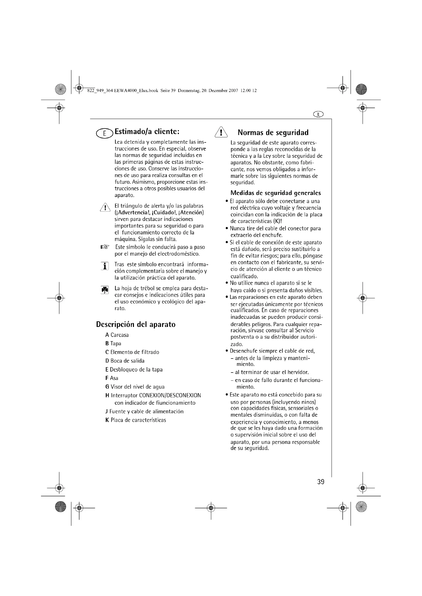Estimado/a cliente: Lea detenida y completamente las ins-trucciones de uso. En especial, observe las normas de seguridad incluidas en las primeras páginas de estas instruc-ciones de uso. Conserve las instruccio-nes de uso para realiza consultas en el futuro. Asimismo, proporcione estas ins-trucciones a otros posibles usuarios del aparato. El triángulo de alerta y/o las palabras (¡Advertencia!, ¡Cuidado!, ¡Atención) sirven para destacar indicaciones importantes para su seguridad o para el funcionamiento correcto de la máquina. Sígalas sin falta.0 Este símbolo le conducirá paso a paso por el manejo del electrodoméstico. Tras este símbolo encontrará informa-ción complementaria sobre el manejo y la utilización práctica del aparato. La hoja de trébol se emplea para desta-car consejos e indicaciones útiles para el uso económico y ecológico del apa-rato. Descripción del aparato A CarcasaB TapaC Elemento de filtradoD Boca de salidaE Desbloqueo de la tapaF AsaG Visor del nivel de aguaH Interruptor CONEXION/DESCONEXION con indicador de fiuncionamientoJ Fuente y cable de alimentaciónK Placa de características 1 Normas de seguridad La seguridad de este aparato corres-ponde a las reglas reconocidas de la técnica y a la Ley sobre la seguridad de aparatos. No obstante, como fabri-cante, nos vemos obligados a infor-marle sobre las siguientes normas de seguridad.Medidas de seguridad generales• El aparato sólo debe conectarse a una red eléctrica cuyo voltaje y frecuencia coincidan con la indicación de la placa de características (K)!• Nunca tire del cable del conector para extraerlo del enchufe.• Si el cable de conexión de este aparato está dañado, será preciso sustituirlo a fin de evitar riesgos; para ello, póngase en contacto con el fabricante, su servi-cio de atención al cliente o un técnico cualificado.• No utilice nunca el aparato si se le haya caído o si presenta daños visibles. • Las reparaciones en este aparato deben ser ejecutadas únicamente por técnicos cualificados. En caso de reparaciones inadecuadas se pueden producir consi-derables peligros. Para cualquier repa-ración, sírvase consultar al Servicio postventa o a su distribuidor autori-zado.• Desenchufe siempre el cable de red, – antes de la limpieza y manteni-miento.– al terminar de usar el hervidor.– en caso de fallo durante el funciona-miento.• Este aparato no está concebido para su uso por personas (incluyendo ninos) con capacidades físicas, sensoriales o mentales disminuídas, o con falta de experiencia y conocimiento, a menos de que se les haya dado una formación o supervisión inicial sobre el uso del aparato, por una persona responsable de su seguridad.822_949_364 EEWA4000_Elux.book Seite 39 Donnerstag, 20. Dezember 2007 12:00 12e