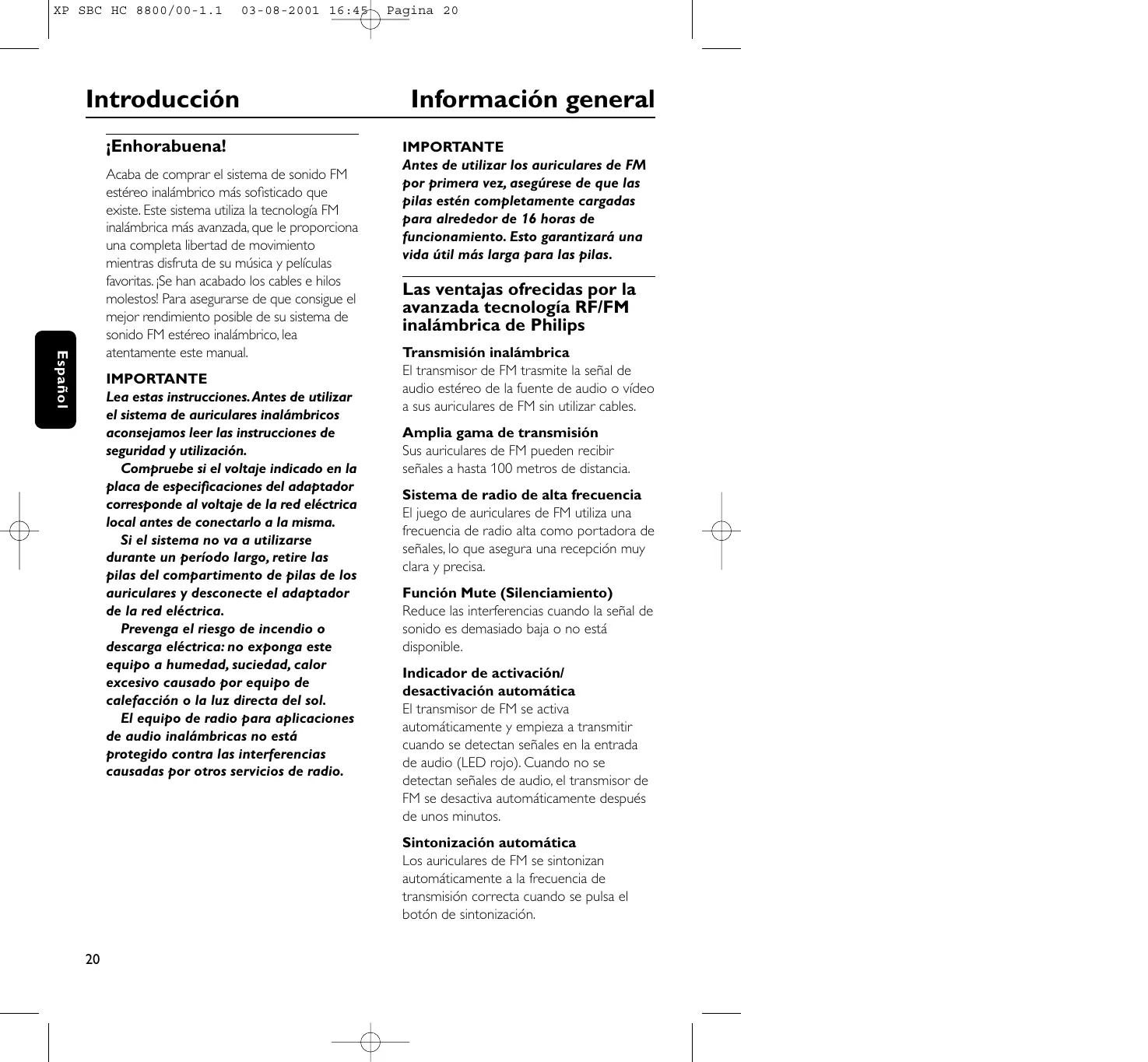 Acaba de comprar el sistema de sonido FM estéreo inalámbrico más sofisticado que existe. Este sistema utiliza la tecnología FM inalámbrica más avanzada, que le proporciona una completa libertad de movimiento mientras disfruta de su música y películas favoritas. ¡Se han acabado los cables e hilos molestos! Para asegurarse de que consigue el mejor rendimiento posible de su sistema de sonido FM estéreo inalámbrico, lea atentamente este manual. IMPORTANTE Lea estas instrucciones.Antes de utilizar el sistema de auriculares inalámbricos aconsejamos leer las instrucciones de seguridad y utilización. Compruebe si el voltaje indicado en la placa de especificaciones del adaptador corresponde al voltaje de la red eléctrica local antes de conectarlo a la misma. Si el sistema no va a utilizarse durante un período largo, retire las pilas del compartimento de pilas de los auriculares y desconecte el adaptador de la red eléctrica. Prevenga el riesgo de incendio o descarga eléctrica: no exponga este equipo a humedad, suciedad, calor excesivo causado por equipo de calefacción o la luz directa del sol. El equipo de radio para aplicaciones de audio inalámbricas no está protegido contra las interferencias causadas por otros servicios de radio. Pagina 20 Información general IMPORTANTE Antes de utilizar los auriculares de FM por primera vez, asegúrese de que las pilas estén completamente cargadas para alrededor de 16 horas de funcionamiento. Esto garantizará una vida útil más larga para las pilas. Las ventajas ofrecidas por la avanzada tecnología RF/FM inalámbrica de Philips Transmisión inalámbrica El transmisor de FM trasmite la señal de audio estéreo de la fuente de audio o vídeo a sus auriculares de FM sin utilizar cables. Amplia gama de transmisión Sus auriculares de FM pueden recibir señales a hasta 100 metros de distancia. Sistema de radio de alta frecuencia El juego de auriculares de FM utiliza una frecuencia de radio alta como portadora de señales, lo que asegura una recepción muy clara y precisa. Función Mute (Silenciamiento) Reduce las interferencias cuando la señal de sonido es demasiado baja o no está disponible. Indicador de activación/ desactivación automática El transmisor de FM se activa automáticamente y empieza a transmitir cuando se detectan señales en la entrada de audio (LED rojo). Cuando no se detectan señales de audio, el transmisor de FM se desactiva automáticamente después de unos minutos. Sintonización automática Los auriculares de FM se sintonizan automáticamente a la frecuencia de transmisión correcta cuando se pulsa el botón de sintonización.