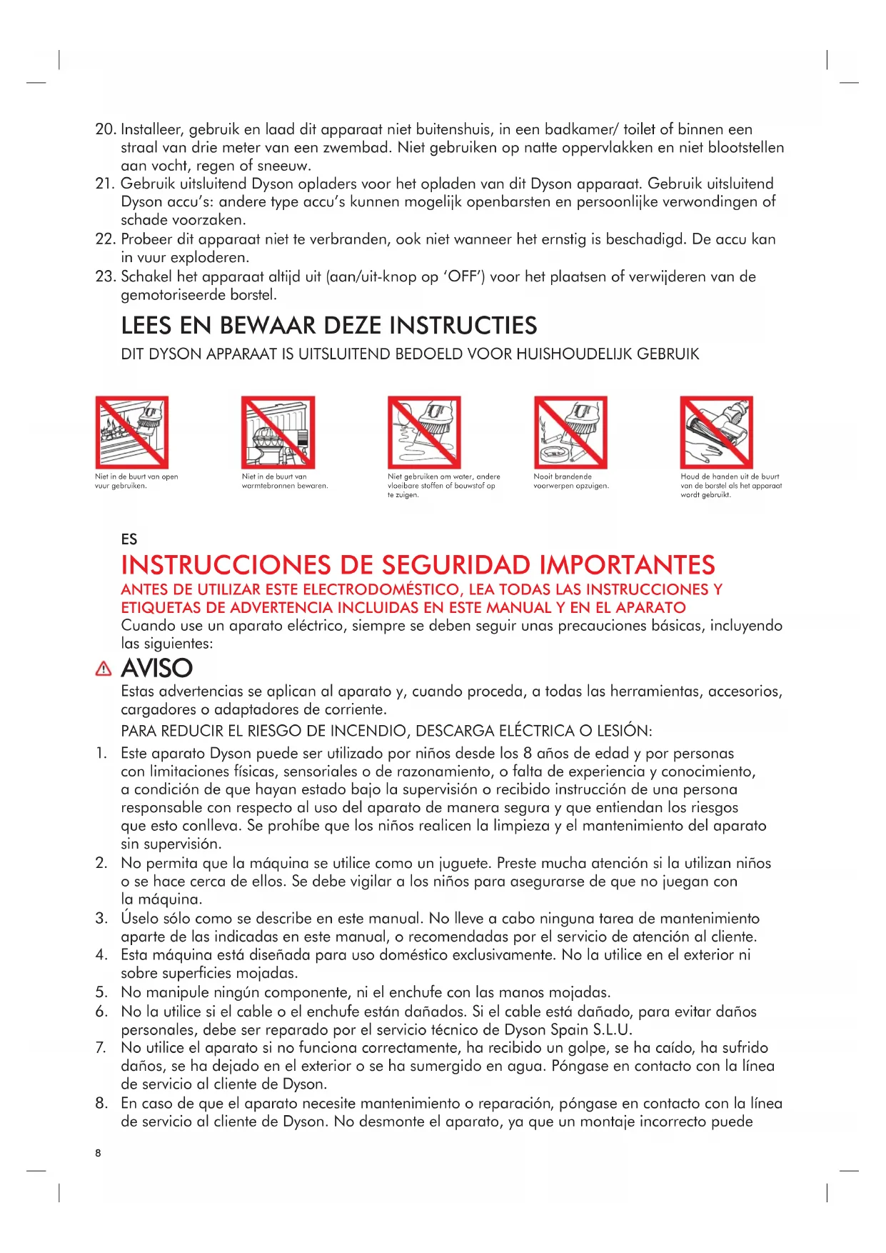 de servicio al cliente de Dyson. No desmonte el aparato, ya que un montaje incorrecto puede Niet in de buurt van open vuur gebruiken. Niet in de buurt van warmtebronnen bewaren. Niet gebruiken om water, andere vloeibare stoffen of bouwstof op te zuigen. Nooit brandende voorwerpen opzuigen. Houd de handen uit de buurt van de borstel als het apparaat wordt gebruikt.9 ocasionar una descarga eléctrica o un incendio.