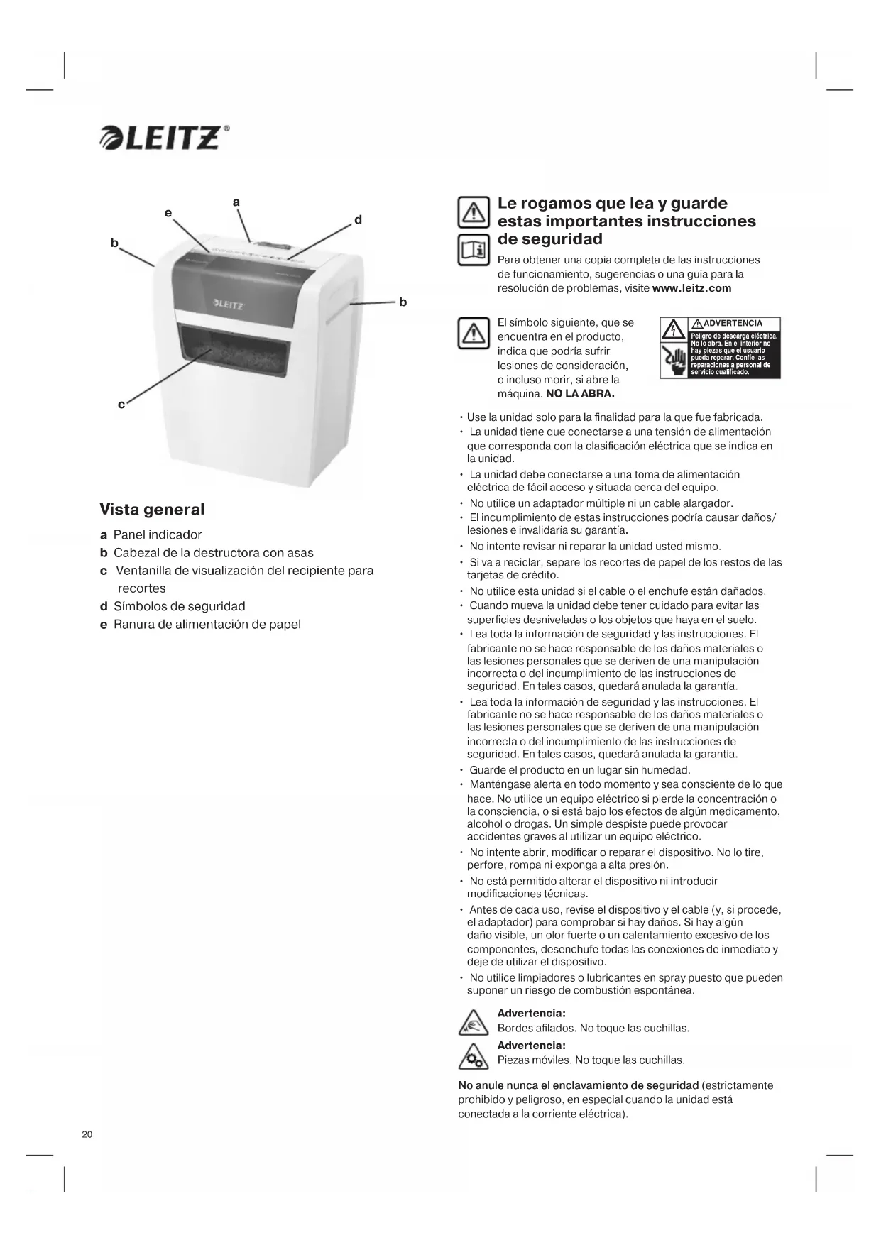 Residuos de aparatos eléctricos y electrónicos (RAEE) Al final de su vida útil, su producto se considera un residuo de aparato eléctrico y electrónico (RAEE). Por lo tanto, es importante que tenga en cuenta lo siguiente: Los RAEE no deben eliminarse como residuos urbanos no seleccionados. Deben recogerse por separado de modo que se puedan desmontar para reciclar, reutilizar y valorizar sus componentes y materiales (como combustible para la recuperación de energía en la producción de electricidad). Los ayuntamientos han creado puntos de recogida públicos para la recogida gratuita de RAEE. Lleve su RAEE al punto de recogida más cercano a su hogar u oficina. Si experimenta alguna dificultad para encontrar un punto de recogida, el comercio que le vendió el producto debería aceptar su RAEE. Si ya no está en contacto con el comercio, póngase en contacto con ACCO para recibir ayuda. El reciclaje de RAEE tiene como finalidad la protección del medio ambiente, la protección de la salud humana, la conservación de materias primas, la mejora del desarrollo sostenible y la garantía de un mejor suministro de productos básicos en la Unión Europea. Esto se consigue mediante la recuperación de materias primas secundarias valiosas y la reducción de la eliminación de residuos. Para contribuir a la consecución de estos objetivos, devuelva su RAEE al punto de recogida. Su producto está marcado con el símbolo RAEE (contenedor de basura con una X). Este símbolo tiene como finalidad informarle de que el RAEE no se puede eliminar como residuo urbano no seleccionado. Garantía El funcionamiento de esta máquina está garantizado durante un período de dos años a partir de la fecha de adquisición, siempre que su utilización sea normal. Durante el plazo de garantía, ACCO Brands Europe, a su propia discreción, reparará o sustituirá el aparato defectuoso gratuitamente. La garantía no cubre los defectos causados por uso indebido o por su utilización para fines inadecuados. Se requerirá un comprobante de la fecha de compra. Las reparaciones o modificaciones realizadas por personas no autorizadas por ACCO Brands Europe anularán la garantía. Nuestro objetivo es asegurar que nuestros productos funcionan según las especificaciones indicadas. Esta garantía no afecta a los derechos legales que tienen los consumidores en virtud de la legislación vigente aplicable que rige la venta de artículos.24 Leia e guarde estas instruções de segurança importantes Para consultar a cópia integral das instruções de funcionamento, sugestões e guia de resolução de problemas, visite o site www.leitz.com Perspetiva Geral a Painel de indicadores b Cabeça da destruidora de papel com pegas c Janela do recipiente de aparas d Símbolos de segurança e Ranhura de entrada do papel