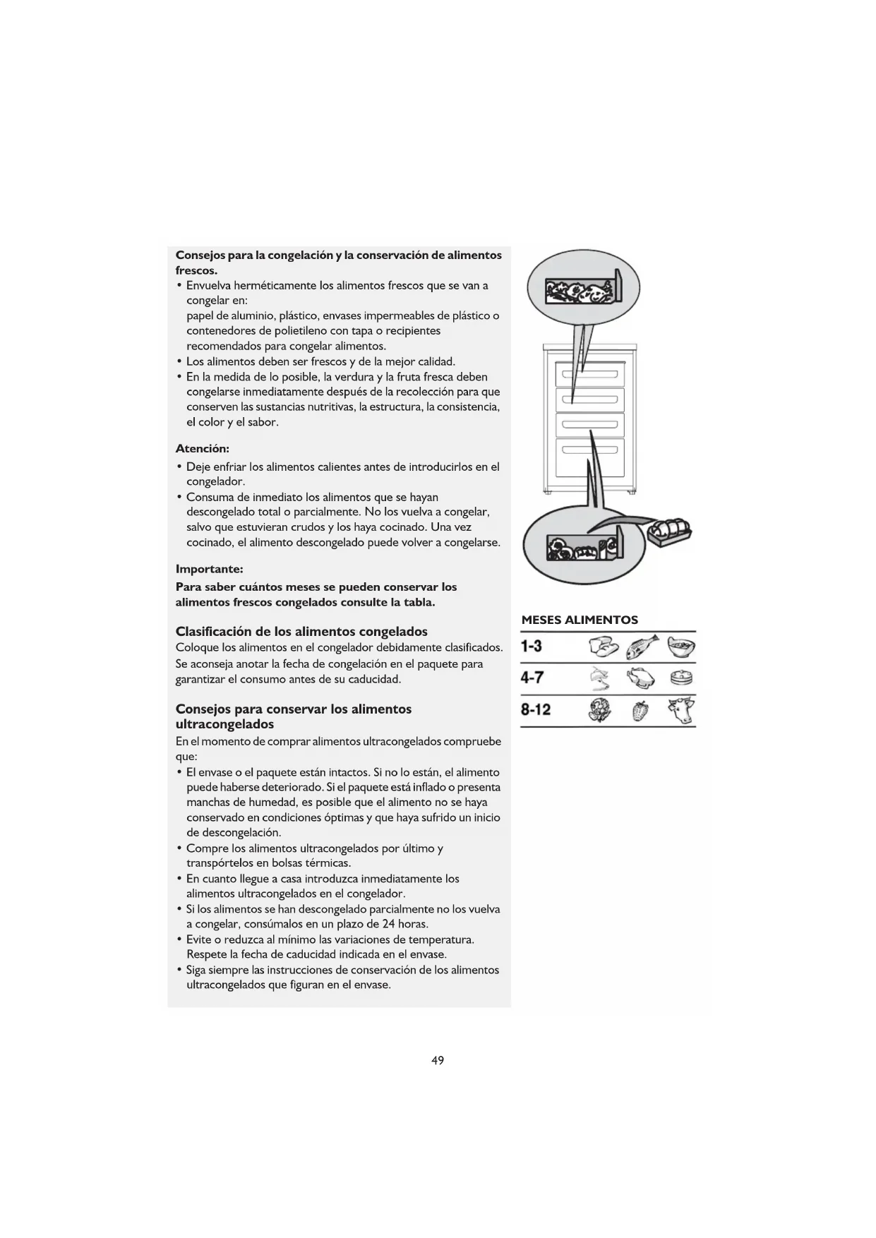 - Siga siempre las instrucciones de conservación de los alimentos ultracongelados que figuran en el envase. MESES ALIMENTOS 49Extracción de los cajones