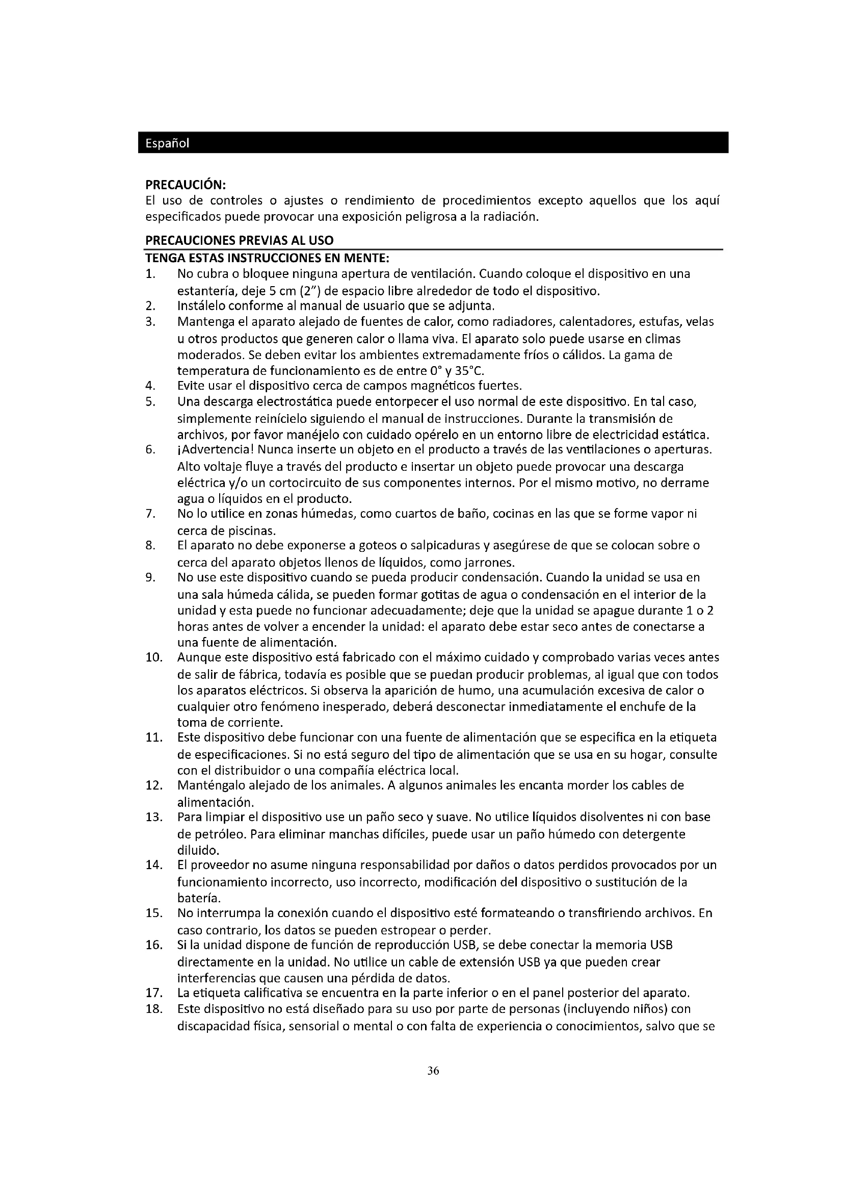 18. Este dispositivo no está diseñado para su uso por parte de personas (incluyendo niños) con