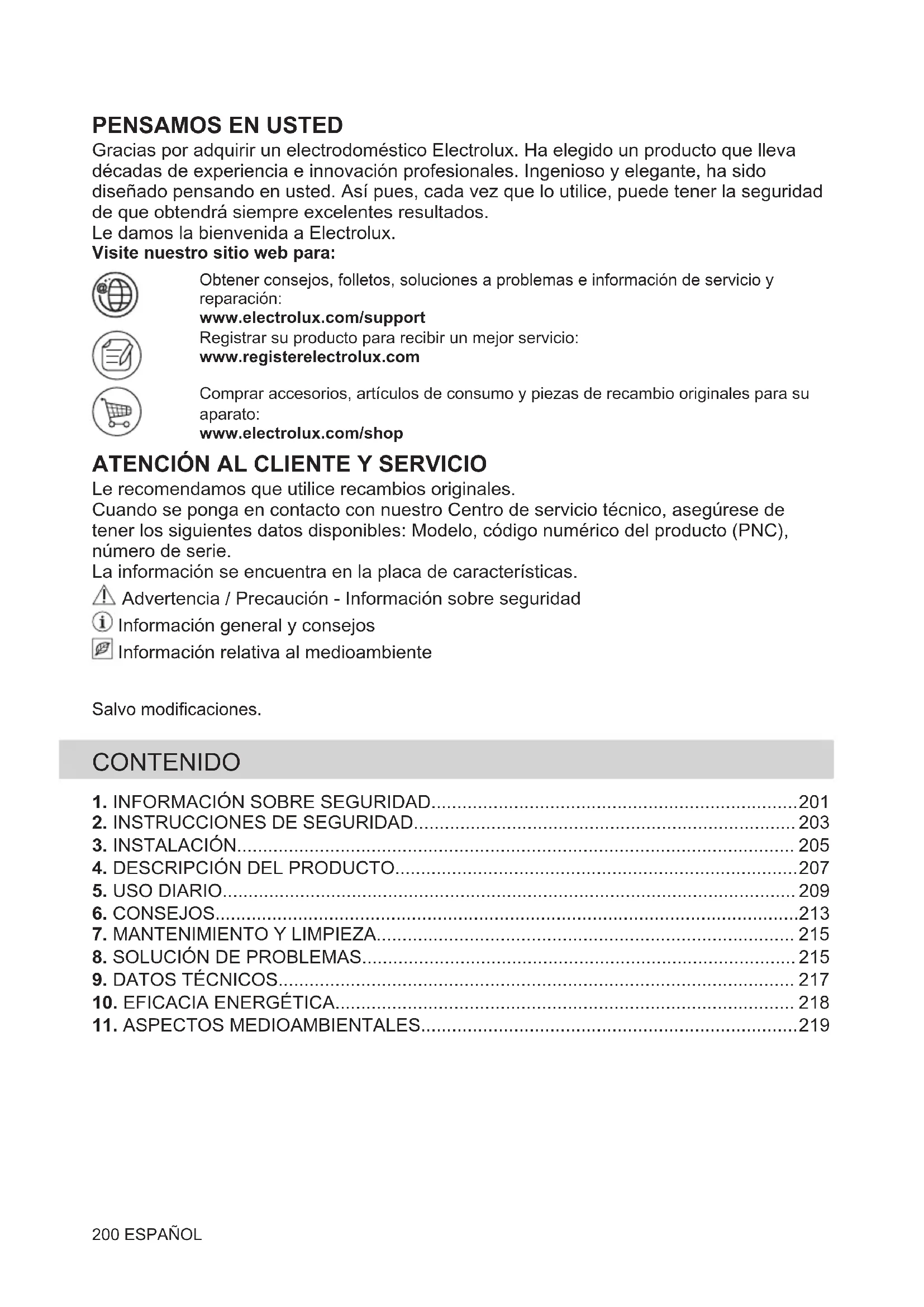 Gracias por adquirir un electrodoméstico Electrolux. Ha elegido un producto que lleva décadas de experiencia e innovación profesionales. Ingenioso y elegante, ha sido diseñado pensando en usted. Así pues, cada vez que lo utilice, puede tener la seguridad de que obtendrá siempre excelentes resultados. Le damos la bienvenida a Electrolux. Visite nuestro sitio web para: Obtener consejos, folletos, soluciones a problemas e información de servicio y reparación: www.electrolux.com/support Registrar su producto para recibir un mejor servicio: www.registerelectrolux.com Comprar accesorios, artículos de consumo y piezas de recambio originales para su aparato: www.electrolux.com/shop