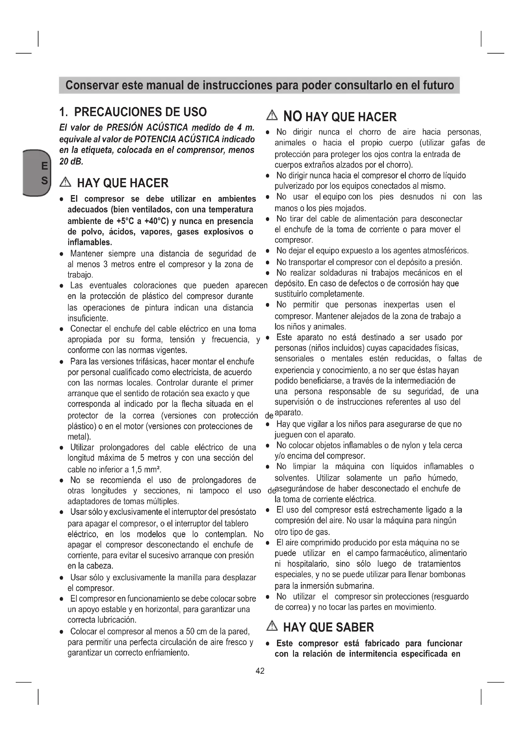 ● No dirigir nunca el chorro de aire hacia personas, animales o hacia el propio cuerpo (utilizar gafas de protección para proteger los ojos contra la entrada de cuerposextrañosalzadosporelchorro). ● Nodirigirnuncahaciaelcompresorelchorrodelíquido pulverizadoporlosequiposconectadosalmismo. ● No usar elequipoconlos pies desnudos ni con las manos o los pies mojados. ● No tirar del cable de alimentación para desconectar el enchufe de la toma de corriente o para mover el compresor. ● Nodejarelequipoexpuestoalosagentesatmosféricos. ● No transportar el compresor con el depósito a presión. ● No realizar soldaduras ni trabajos mecánicos en el depósito.Encasodedefectosodecorrosiónhayque sustituirlo completamente. ● No permitir que personas inexpertas usen el compresor. Mantener alejados de la zona de trabajo a losniñosyanimales. ● Este aparato no está destinado a ser usado por personas(niñosincluidos)cuyascapacidadesfísicas, sensoriales o mentales estén reducidas, o faltas de experienciayconocimiento,anoserqueéstashayan podidobeneficiarse,atravésdelaintermediaciónde una persona responsable de su seguridad, de una supervisión o de instrucciones referentes al uso del aparato. ● Hayquevigilaralosniñosparaasegurarsedequeno jueguen con el aparato. ● No colocar objetos inflamables o de nylon y tela cerca y/oencimadelcompresor. ● No limpiar la máquina con líquidos inflamables o solventes. Utilizar solamente un paño húmedo, asegurándose de haber desconectado el enchufe de la toma de corriente eléctrica. ● El uso del compresor está estrechamente ligado a la compresióndelaire.Nousarlamáquinaparaningún otro tipo de gas. ● Elairecomprimidoproducidoporestamáquinanose puede utilizar en elcampofarmacéutico,alimentario ni hospitalario, sino sólo luego de tratamientos especiales,ynosepuedeutilizarparallenarbombonas para la inmersión submarina. ● No utilizar el compresorsinprotecciones(resguardo decorrea)ynotocarlaspartesenmovimiento.