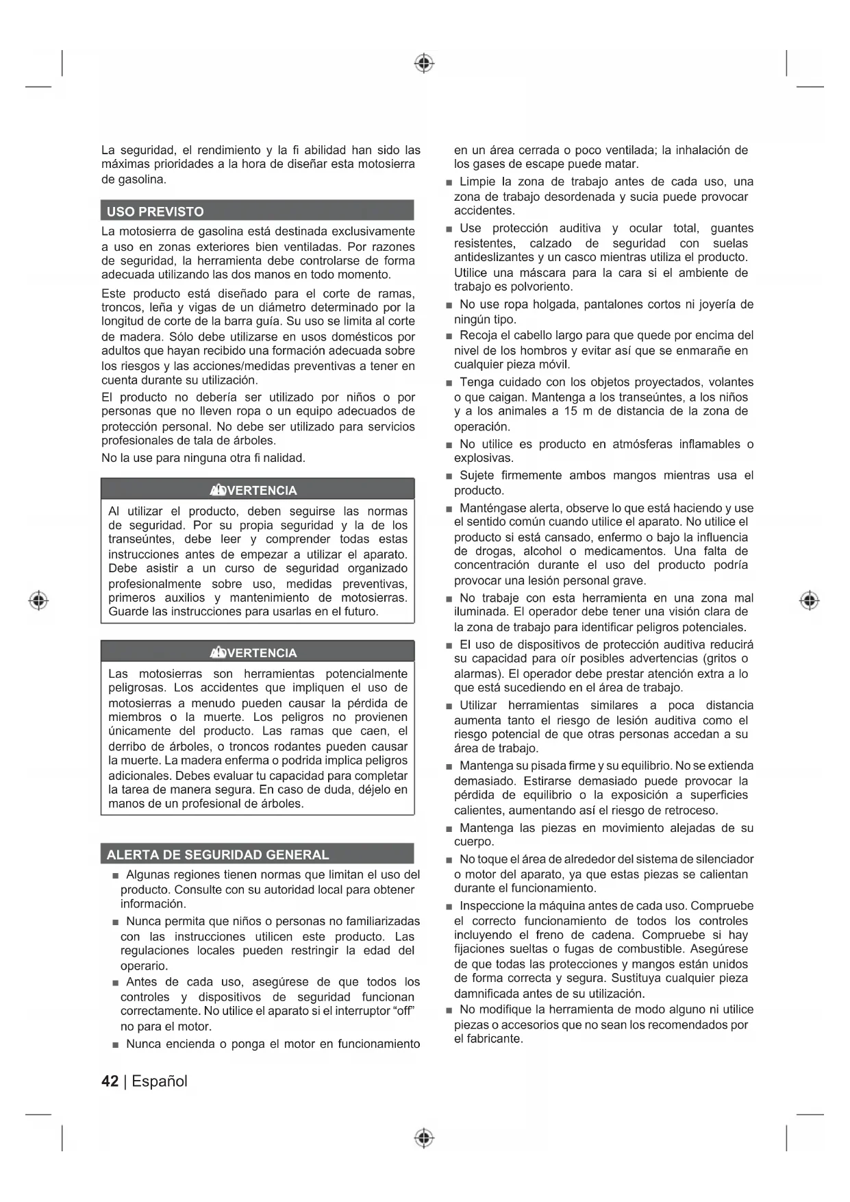 Al utilizar el producto, deben seguirse las normas de seguridad. Por su propia calidad y la de los transeulentes, deben leer y comprender todas estas instrucciones antes de empezar a utiliser el aparato. Debe asistir a un camino decurity organizado profesonamente sobre uso, medidas preventivas, primeros auxilios y mantenimiento de motosierras. Guarde las instrucciones para usarlas en el futuro.
