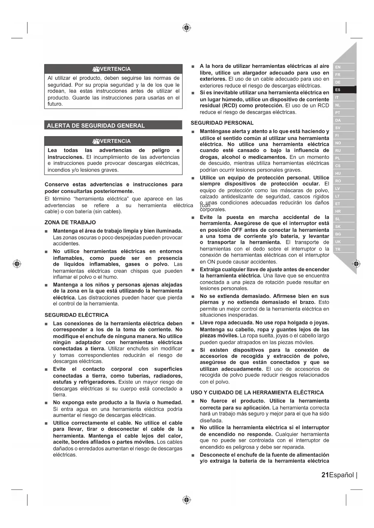 ADVERTENCIA Lea todas las advertencias de peligro e instrucciones. El incumplimiento de las advertencias e instrucciones puede provocar descargas eléctricas, incendios y/o lesiones graves. Conserve estas advertencias e instrucciones para poder consultarlas posteriormente. El término “herramienta eléctrica” que aparece en las DGYHUWHQFLDV VH UH¿HUH D VX KHUUDPLHQWD HOpFWULFD FRQ FDEOHRFRQEDWHUtDVLQFDEOHV