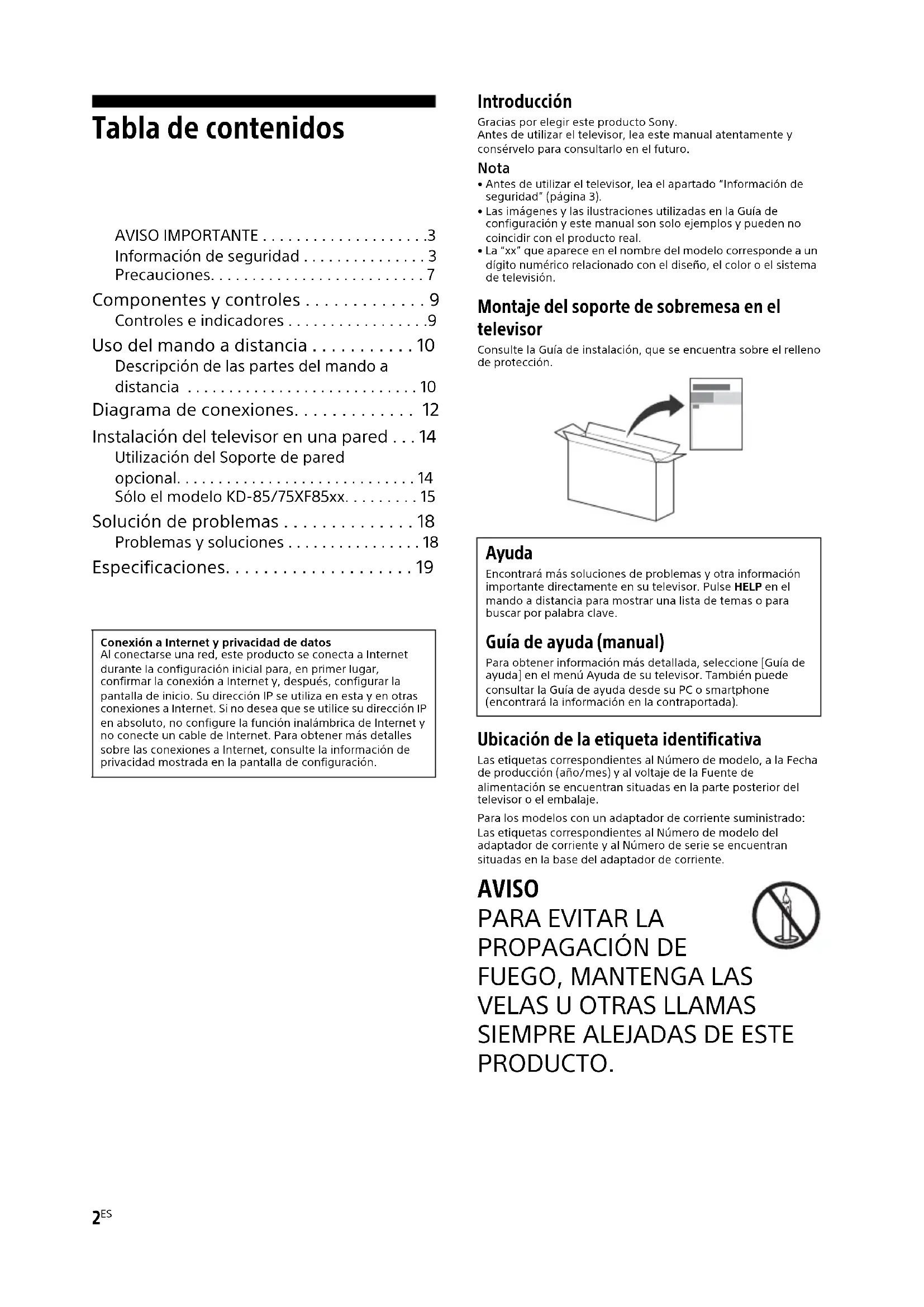 AVISO IMPORTANTE Nota sobre equipos inalámbricos Por la presente, Sony Visual Products Inc. declara que los tipos de equipo radioeléctrico KD-85XF8596, KD-75XF8596, KD-65XF8796, KD-65XF8599, KD-65XF8596, KD-65XF8588, KD-65XF8577, KD-65XF8505, KD-55XF8796, KD-55XF8599, KD-55XF8596, KD-55XF8588, KD-55XF8577, KD-55XF8505, KD-49XF8796, KD-49XF8599, KD-49XF8596, KD-49XF8588, KD-49XF8577, KD-49XF8505, KD-43XF8796, KD-43XF8599, KD-43XF8596, KD-43XF8588, KD-43XF8577, KD-43XF8505 son conformes con la Directiva 2014/53/UE. El texto completo de la declaración UE de conformidad está disponible en la dirección Internet siguiente: http://www.compliance.sony.de/ Este equipo de radio se puede usar en la UE sin infringir los requisitos aplicables relativos al uso del radioespectro. Aviso para los clientes: la siguiente información solamente es aplicable a los equipos comercializados en los países que cumplan las directivas de la UE. El sistema inalámbrico de televisión puede utilizarse en los siguientes países: AT, BE, HR, CY, CZ, DK, EE, FI, FR, DE, EL, HU, IE, IT, LV, LT, LU, MT, NL, PL, PT, SK, SI, ES, SE, UK, IS, LI, NO, CH, BG, RO, TR, AL, BA, MK, MD, RS, ME, Kosovo Este producto puede utilizarse en otros países no europeos. Información de seguridad AVISO Precaución Riesgo de explosión si se sustituye la pila por una del tipo incorrecto. No exponga las pilas a un calor excesivo, como la luz solar directa o una llama, ni a una presión atmosférica extremadamente baja que pueda dar lugar a una explosión o fuga de líquido o gas inflamables. Riesgo de estabilidad El televisor se puede caer provocando lesiones personales graves o la muerte. No coloque nunca un televisor en una ubicación inestable. Un televisor se puede caer provocando lesiones personales graves o la muerte. Muchas lesiones, particularmente en los niños, pueden ser evitadas tomando simples precauciones como:
